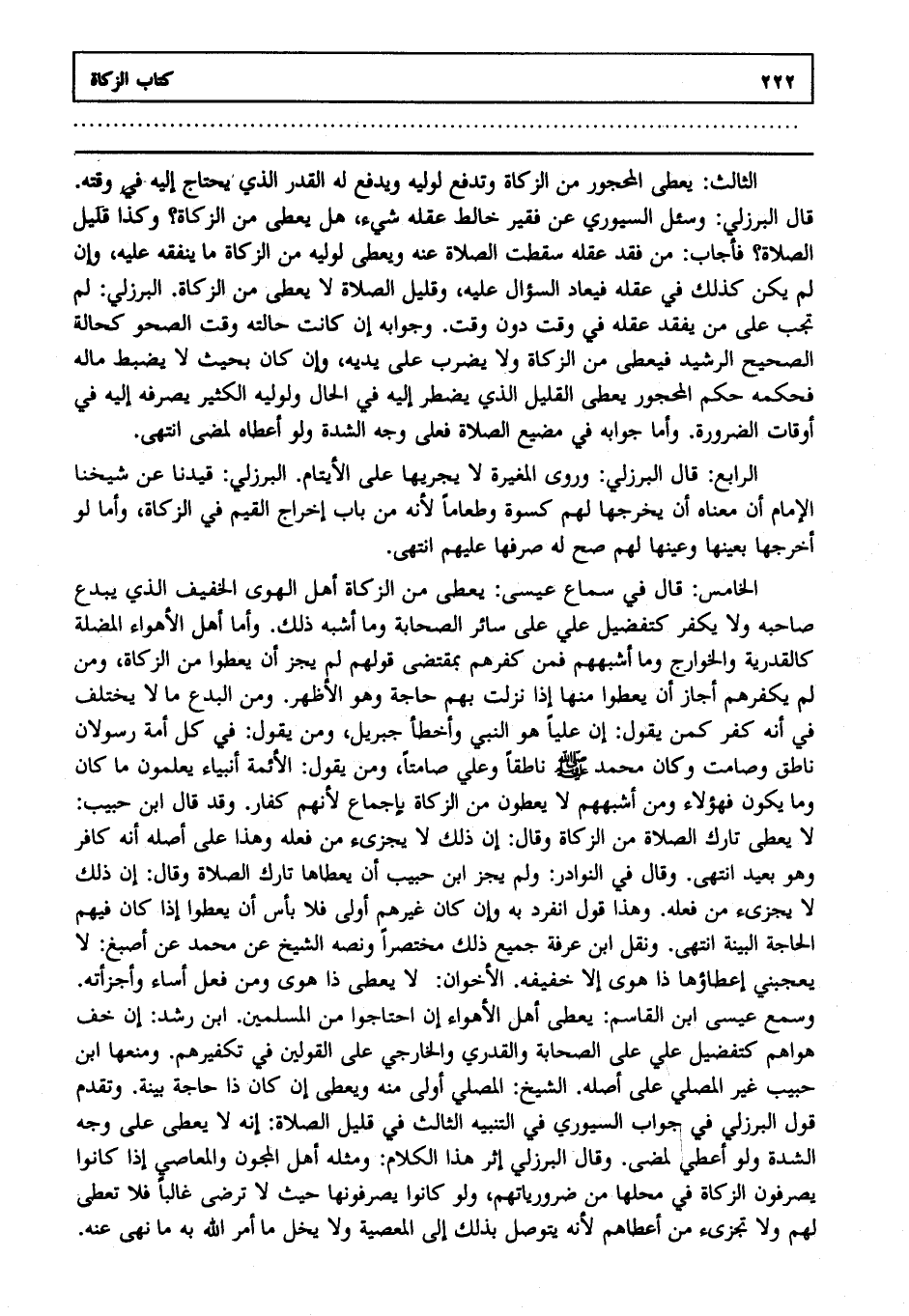 الثالث: يعطى المحجور من الزكاة وتدفع لوليه ويدفع له القدر الذي يحتاج إليه في وقته قال البرزلي: وسئل السيوري عن فقير خالط عقله شيء هل يعطى من الزكاة وكذا قليل الصلاة فأجاب من فقد عقله سقطت الصلاة عنه ويعطى لوليه من الزكاة ما ينفقه عليه وإن لم يكن كذلك في عقله فيعاد السؤال عليه وقليل الصلاة لا يعطى من الزكاة البرزلي لم تجب على من يفقد عقله في وقت دون وقت وجوابه إن كانت حالته وقت الصحو كحالة الصحيح الرشيد فيعطى من الزكاة ولا يضرب على يديه وإن كان بحيث لا يضبط ماله فحكمه حكم المحجور يعطى القليل الذي يضطر إليه في الحال ولوليه الكثير يصرفه إليه في أوقات الضرورة وأما جوابه في مضيع الصلاة فعلى وجه الشدة ولو أعطاه لمضى انتهى.