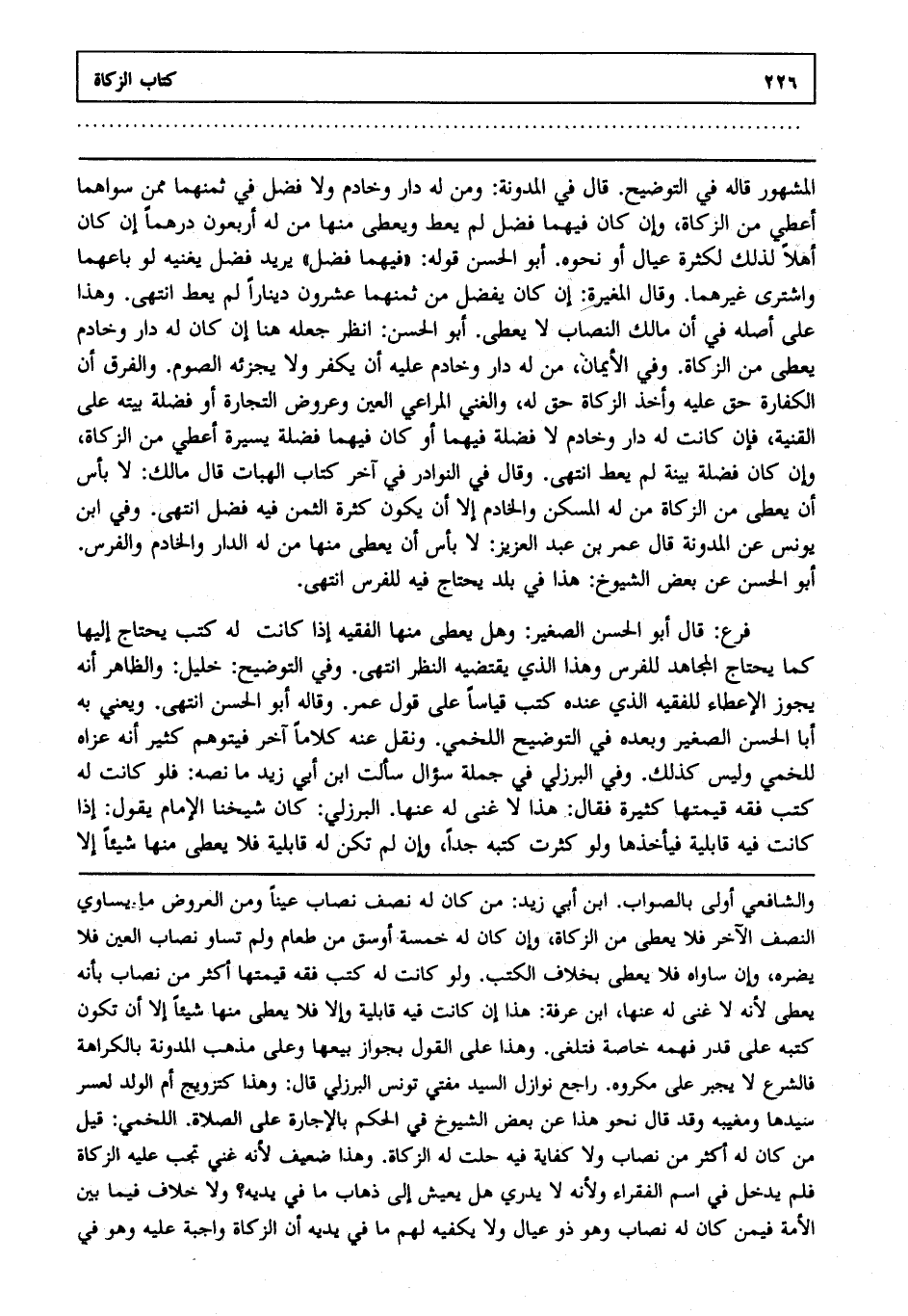 فرع: قال أبو الحسن الصغير: وهل يعطى منها الفقيه إذا كانت له كتب يحتاج إليها كما يحتاج المجاهد للفرس وهذا الذي يقتضيه النظر انتهى. وفي التوضيح خليل والظاهر أنه يجوز الإعطاء للفقيه الذي عنده كتب قياسا على قول عمر وقاله أبو الحسن انتهى. ويعني به أبا الحسن الصغير وبعده في التوضيح اللخمي ونقل عنه كلاما آخر فيتوهم كثير أنه عزاه للخمي وليس كذلك وفي البرزلي في جملة سؤال سألت ابن أبي زيد ما نصه فلو كانت له كتب فقه قيمتها كثيرة فقال هذا لا غنى له عنها البرزلي كان شيخنا الإمام يقول إذا كانت فيه قابلية فيأخذها ولو كثرت كتبه جدا وإن لم تكن له قابلية فلا يعطى منها شيئا إلا