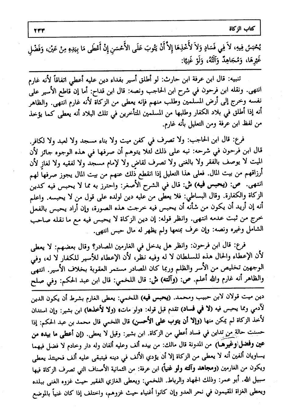 فرع: قال ابن الحاجب: ولا تصرف في كفن ميت ولا بناء مسجد ولا لعبد ولا لكافر قال ابن فرحون في شرحه: نبه على ذلك لئلا يتوهم أن صرفها في هذه الوجوه جائز لأن الميت لا يوصف بالفقر ولا بالغنى ولا تصرف لقاض ولا لإمام مسجد ولا لفقيه ولا لغاز لأن أرزاقهم من بيت المال فعلى هذا التعليل إذا انقطع ذلك عنهم من بيت المال يجوز صرفها لهم انتهى. ص: "يحبس فيه". ش: قال في الشرح الأصغر واحترز به مما لا يحبس فيه كدين الزكاة والكفارة وقال البساطي فلا يعطى من عليه دين لولده على قول من لا يحبسه واعلم أنه إن أريد أن يكون من شأنه أن يحبس فيه خرجت هذه الصورة وإن أراد يحبس بالفعل خرج من ثبت عدمه انتهى. وانظر قوله: إن دين الزكاة لا يحبس فيه مع ما نقله صاحب الشامل وغيره ونصه وإن عرف بمنعها ولم يظهر له مال حبس انتهى.