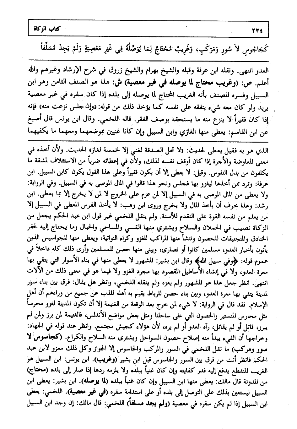 العدو انتهى. ونقله ابن عرفة وقبله الشيخ بهرام والشيخ زروق في شرح الإرشاد وغيرهم والله أعلم. ص: "وغريب محتاج لما يوصله في غير معصية". ش: هذا هو الصنف الثامن وهو ابن السبيل وفسره المصنف بأنه الغريب المحتاج لما يوصله إلى بلده إذا كان سفره في غير معصية يريد ولو كان معه شيء ينفقه على نفسه كما يؤخذ ذلك من قوله: إن جلس نزعت منه فإنه إذا كان فقيرا لا ينزع منه ما يستحقه بوصف الفقر قاله اللخمي وقال ابن يونس: قال أصبغ عن ابن القاسم: يعطى منها الغازي وابن السبيل وإن كانا غنيين بموضعهما ومعهما ما يكفيهما