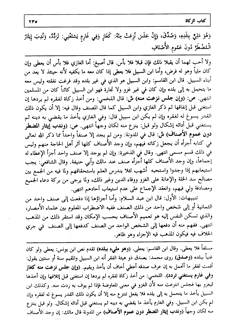 ولا أحب لهما أن يقبلا ذلك فإن قبلا فلا بأس قال أصبغ أما الغازي فلا بأس أن يعطى وإن كان مليا وهو له فرض وأما ابن السبيل فلا يعطى إذا كان معه ما يكفيه لأنه حينئذ لا يعد من أبناء السبيل قال ابن القاسم: وابن السبيل هو الذي في غير بلده وقد فرغت نفقته وليس معه ما يتحمل به إلى بلده وإن كان في غير غزو ولا تجارة فهو ابن السبيل كائنا كان من المسلمين انتهى. ص: "وإن جلس نزعت منه". ش: قال اللخمي: ومن أخذ زكاة لفقره لم يردها إن استغنى قبل إنفاقها ثم ذكر الغازي وابن السبيل كما قال المصنف وقال فيه إلا أن يكون ذلك القدر يسوغ له لفقره وإن لم يكن ابن سبيل قال وفي الغازي يأخذ ما يقضي به دينه ثم يستغني قبل أدائه إشكال ولو قيل ينزع منه لكان وجها انتهى. ص: "وندب إيثار المضطر دون عموم الأصناف". ش: قال في المدونة ومن لم يجد إلا صنفا واحدا مما ذكر الله تعالى في كتابه أجزأه أن يجعل زكاته فيهم وإن وجد الأصناف كلها آثر أهل الحاجة منهم وليس في ذلك قسم مسمى انتهى. وقال في الذخيرة: وإن لم يوجد إلا صنف واحد أجزأ الإعطاء له إجماعا وإن وجد الأصناف كلها أجزأه صنف عند مالك وأبي حنيفة وقال الشافعي: يجب استيعابهم إذا وجدوا واستحبه أشهب لئلا يندرس العلم باستحقاقهم ولما فيه من الجمع بين مصالح سد الخلة والإعانة على الغزو ووفاء الدين وغير ذلك ولما يرجى من بركة دعاء الجميع ومصادفة ولي فيهم وانعقد الإجماع على عدم استيعاب آحادهم انتهى.