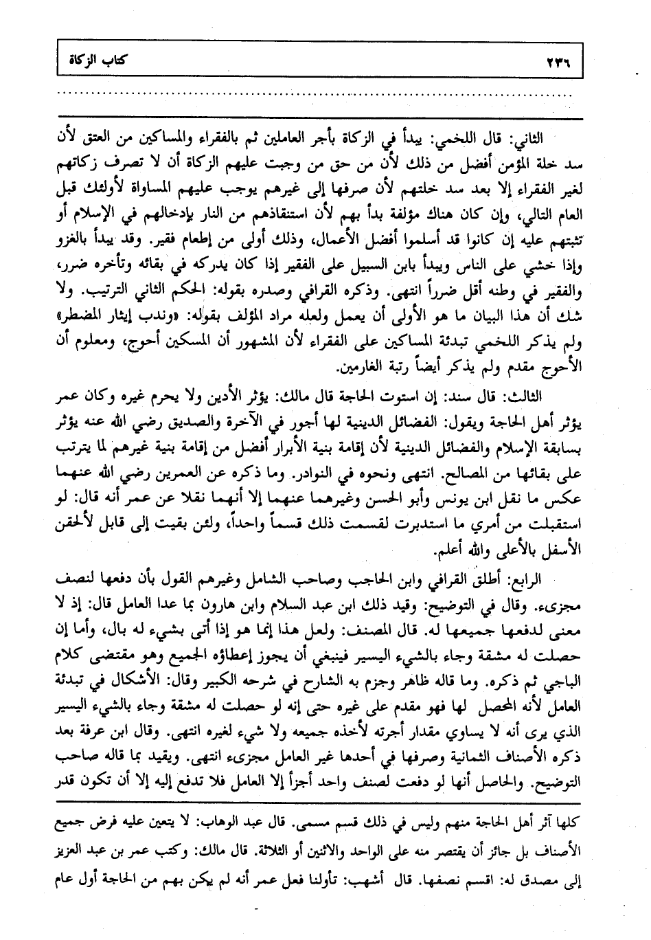 الثاني قال اللخمي: يبدأ في الزكاة بأجر العاملين ثم بالفقراء والمساكين من العتق لأن سد خلة المؤمن أفضل من ذلك لأن من حق من وجبت عليهم الزكاة أن لا تصرف زكاتهم لغير الفقراء إلا بعد سد خلتهم لأن صرفها إلى غيرهم يوجب عليهم المساواة لأولئك قبل العام التالي وإن كان هناك مؤلفة بدأ بهم لأن استنقاذهم من النار بإدخالهم في الإسلام أو تثبتهم عليه إن كانوا قد أسلموا أفضل الأعمال وذلك أولى من إطعام فقير وقد يبدأ بالغزو إذا خشي على الناس ويبدأ بابن السبيل على الفقير إذا كان يدركه في بقائه وتأخره ضرر والفقير في وطنه أقل ضررا انتهى. وذكره القرافي وصدره بقوله الحكم الثاني الترتيب ولا شك أن هذا البيان ما هو الأولى أن يعمل ولعله مراد المؤلف بقوله وندب إيثار المضطر ولم يذكر اللخمي تبدئة المساكين على الفقراء لأن المشهور أن المسكين أحوج ومعلوم أن الأحوج مقدم ولم يذكر أيضا رتبة الغارمين.