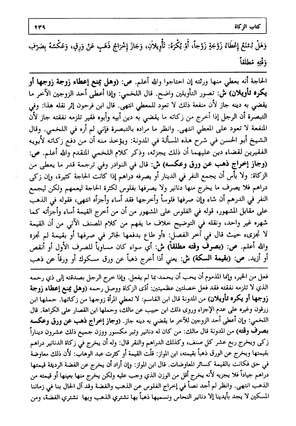 وهل يمنع إعطاء زوجة زوجا أو يكره تأويلان وجاز إخراج ذهب عن ورق وعكسه بصرف وقته مطلقا