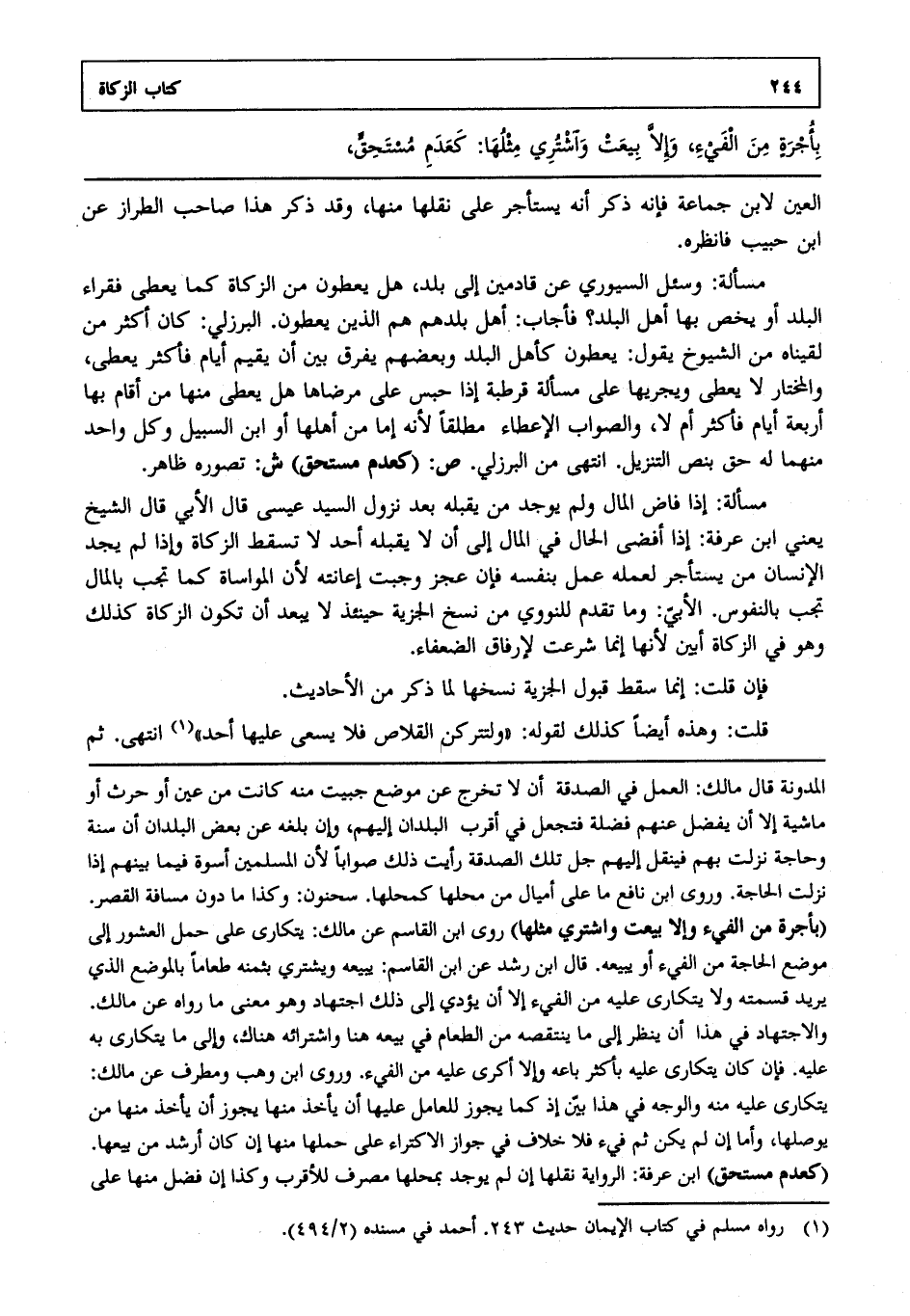مسألة: وسئل السيوري عن قادمين إلى بلد هل يعطون من الزكاة كما يعطى فقراء البلد أو يخص بها أهل البلد فأجاب أهل بلدهم هم الذين يعطون البرزلي كان أكثر من لقيناه من الشيوخ يقول يعطون كأهل البلد وبعضهم يفرق بين أن يقيم أيام فأكثر يعطى والمختار لا يعطى ويجريها على مسألة قرطبة إذا حبس على مرضاها هل يعطى منها من أقام بها أربعة أيام فأكثر أم لا والصواب الإعطاء مطلقا لأنه إما من أهلها أو ابن السبيل وكل واحد منهما له حق بنص التنزيل انتهى. من البرزلي. ص: "كعدم مستحق". ش: تصوره ظاهر. مسألة: إذا فاض المال ولم يوجد من يقبله بعد نزول السيد عيسى قال الأبي قال الشيخ يعني ابن عرفة إذا أفضى الحال في المال إلى أن لا يقبله أحد لا تسقط الزكاة وإذا لم يجد الإنسان من يستأجر لعمله عمل بنفسه فإن عجز وجبت إعانته لأن المواساة كما تجب بالمال تجب بالنفوس الأبي وما تقدم للنووي من نسخ الجزية حينئذ لا يبعد أن تكون الزكاة كذلك وهو في الزكاة أبين لأنها إنما شرعت لإرفاق الضعفاء.