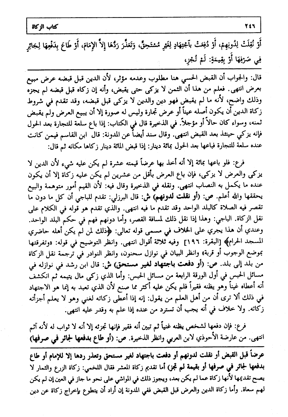 فرع: فلو باعها بمائة إلا أنه أخذ بها عرضا قيمته عشرة لم يكن عليه شيء لأن الدين لا يزكى والعرض لا يزكى فإن باع العرض بأقل من عشرين لم يكن عليه زكاة إلا أن يكون عنده ما يكمل به النصاب انتهى. ونقله في الذخيرة وقال فيه لأن القيم أمور متوهمة والبيع يحققها والله أعلم. ص: "أو نقلت لدونهم". ش: قال البرزلي: تقدم للباجي أن كل ما دون ما تقصر فيه الصلاة كالبلد الواحد وقد تقدم ما فيه انتهى. والذي تقدم هو قوله في الكلام على نقل الزكاة الباجي وهذا إذا نقل ذلك لمسافة القصر وأما دونهم فهم في حكم البلد الواحد وعندي أن هذا يجري على الخلاف في مسمى قوله تعالى: {ذَلِكَ لِمَنْ لَمْ يَكُنْ أَهْلُهُ حَاضِرِي الْمَسْجِدِ} [البقرة: من الآية196] وفيه ثلاثة أقوال انتهى. وانظر التوضيح في قوله: وتفرقتها بموضع الوجوب أو قربة وانظر البيان في نوازل سحنون وانظر النوادر في ترجمة نقل الزكاة من بلد إلى بلد. ص: "أو دفعت باجتهاد لغير مستحق". ش: قال ابن رشد في نوازله في مسائل الحبس في أول الورقة الرابعة من مسائل الحبس: وأما الذي زكى مال يتيمه ثم انكشف أنه أعطاه غنياً وهو يظنه فقيرا فلم يكن عليه أكثر مما صنع لأن الذي تعبد به إنما هو الاجتهاد في ذلك ألا ترى أن من أهل العلم من يقول إنه إذا أعطى زكاته لغني وهو لا يعلم أجزأته زكاته ولا خلاف في أنه يجب أن تسترد من عنده إذا علم به وقدر عليه انتهى.