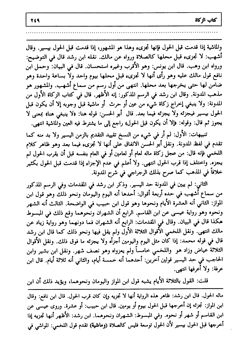 تنبيهات: الأول: لم أر في شيء من النسخ تقييد التقديم بالزمن اليسير ولا بد منه كما تقدم في لفظ المدونة ونقل أبو الحسن الاتفاق على أنها لا تجزئ فيما بعد وهو ظاهر كلام اللخمي فإنه قال من عجل زكاة ماله لعام أو لعامين أو في العام بنفسه قبل أن يقرب الحول لم يجزه واختلف إذا قرب الحول انتهى. , ولا أعلم في عدم الاجزاء إذا قدمت قبل الحول بكثير خلافاً في المذهب كما صرح به الرجراجي في شرح المدونة.