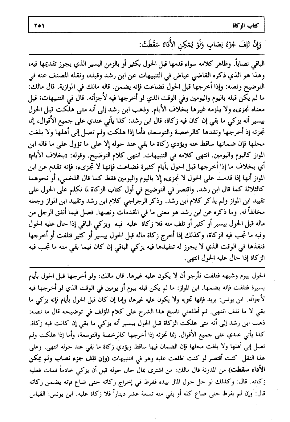 الباقي نصاباً وظاهر كلامه سواء قدمها قبل الحول بكثير أو بالزمن اليسير الذي يجوز تقديمها فيه وهذا هو الذي ذكره القاضي عياض في التنبيهات عن ابن رشد وقبله ونقله المصنف عنه في التوضيح ونصه وإذا أخرجها قبل الحول فضاعت فإنه يضمن قاله مالك في الموازية قال مالك: ما لم يكن قبله باليوم واليومين وفي الوقت الذي لو أخرجها فيه لأجزأته قال في التنبيهات قيل معناه تجزئ ولا يلزمه غيرها بخلاف الأيام وذهب ابن رشد إلى أنه متى هلكت قبل الحول بيسير أنه يزكي ما بقي إن كان فيه زكاة قال ابن رشد: كذا يأتي عندي على جميع الأقوال إنما تجزئه إذ أخرجها ونقدها كالرخصة والتوسعة فأما إذا هلكت ولم تصل إلى أهلها ولا بلغت محلها فإن ضمانها ساقط عنه ويؤدي زكاة ما بقي عند حوله إلا على ما تؤول على ما قاله ابن المواز كاليوم واليومين انتهى. كلامه في التنبيهات انتهى. كلام التوضيح وقوله بخلاف الأيام أي بخلاف ما إذا أخرجها قبل الحول بأيام كثيرة فضاعت فإنها لا تجزئ فإنه تقدم عن ابن المواز أنها إذا قدمت على الحول لا تجزئ إلا باليوم واليومين فقط كما قال اللخمي: أو نحوهما كالثلاثة كما قال ابن رشد واقتصر في التوضيح في أول كتاب الزكاة لما تكلم على الحول على تقييد ابن المواز ولم يذكر كلام ابن رشد وذكر الرجراجي كلام ابن رشد وتقييد ابن المواز وجعله مخالفا له وما ذكره عن ابن رشد هو معنى ما في المقدمات ونصها فصل فيما أنفق الرجل من ماله قبل الحول بيسير أو كثير أو تلف منه فلا زكاة عليه فيه ويزكي الباقي إذا حال عليه الحول وفيه ما تجب فيه الزكاة وكذلك إذا أخرج زكاة ماله قبل الحول بيسير أو كثير فتلفت أو أخرجها فنفذها في الوقت الذي لا يجوز له تنفيذها فيه يزكي الباقي إن كان فيما بقي منه ما تجب فيه الزكاة إذا حال عليه الحول انتهى