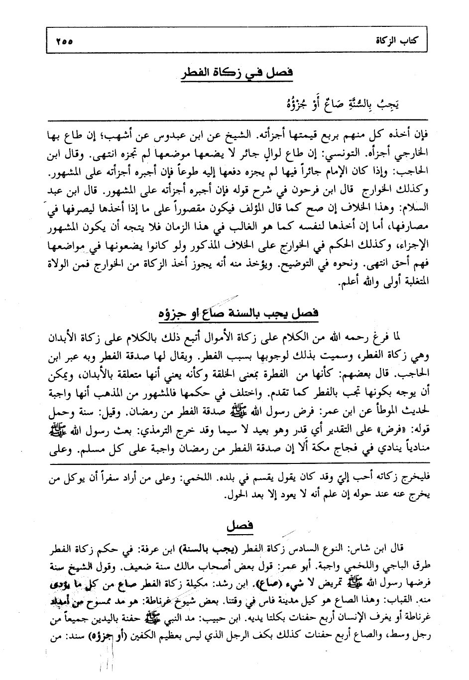 لما فرغ رحمه الله من الكلام على زكاة الأموال تبع ذلك بالكلام على زكاة الأبدان وهي زكاة الفطر وسميت بذلك لوجوبها بسبب الفطر ويقال لها صدقة الفطر وبه عبر ابن الحاجب قال بعضهم كأنها من الفطرة بمعنى الخلقة وكأنه يعني أنها متعلقة بالأبدان ويمكن أن يوجه بكونها تجب بالفطر كما تقدم واختلف في حكمها فالمشهور من المذهب أنها واجبة لحديث الموطأ عن ابن عمر فرض رسول الله صلى الله عليه وسلم صدقة الفطر من رمضان وقيل سنة وحمل قوله: فرض على التقدير أي قدر وهو بعيد لا سيما وقد خرج الترمذي بعث رسول الله صلى الله عليه وسلم مناديا ينادي في فجاج مكة ألا إن صدقة الفطر من رمضان واجبة على كل مسلم وعلى
