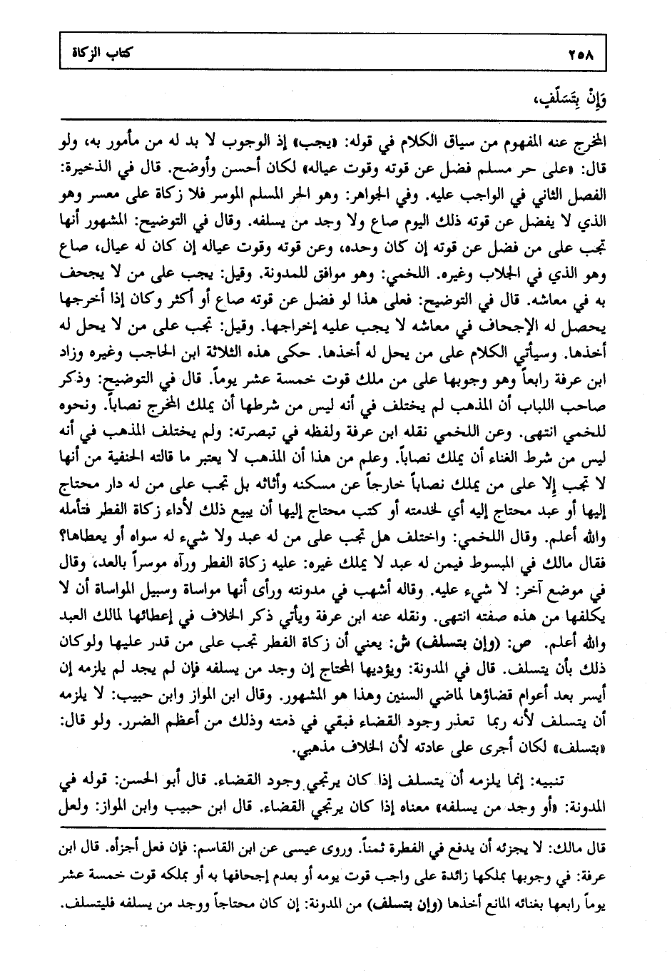 المخرج عنه المفهوم من سياق الكلام في قوله: يجب إذ الوجوب لا بد له من مأمور به ولو قال على حر مسلم فضل عن قوته وقوت عياله لكان أحسن وأوضح قال في الذخيرة: الفصل الثاني في الواجب عليه وفي الجواهر وهو الحر المسلم الموسر فلا زكاة على معسر وهو الذي لا يفضل عن قوته ذلك اليوم صاع ولا وجد من يسلفه و قال في التوضيح: المشهور أنها تجب على من فضل عن قوته إن كان وحده وعن قوته وقوت عياله إن كان له عيال صاع وهو الذي في الجلاب وغيره اللخمي وهو موافق للمدونة وقيل يجب على من لا يجحف به في معاشه قال في التوضيح: فعلى هذا لو فضل عن قوته صاع أو أكثر وكان إذا أخرجها يحصل له الإجحاف في معاشه لا يجب عليه إخراجها وقيل تجب على من لا يحل له أخذها وسيأتي الكلام على من يحل له أخذها حكى هذه الثلاثة ابن الحاجب وغيره وزاد ابن عرفة رابعا وهو وجوبها على من ملك قوت خمسة عشر يوما قال في التوضيح: وذكر صاحب اللباب أن المذهب لم يختلف في أنه ليس من شرطها أن يملك المخرج نصاباً ونحوه للخمي انتهى. وعن اللخمي نقله ابن عرفة ولفظه في تبصرته ولم يختلف المذهب في أنه ليس من شرط الغناء أن يملك نصاباً وعلم من هذا أن المذهب لا يعتبر ما قالته الحنفية من أنها لا تجب إلا على من يملك نصاباً خارجا عن مسكنه وأثاثه بل تجب على من له دار محتاج إليها أو عبد محتاج إليه أي لخدمته أو كتب محتاج إليها أن يبيع ذلك لأداء زكاة الفطر فتأمله والله أعلم. وقال اللخمي: واختلف هل تجب على من له عبد ولا شيء له سواه أو يعطاها فقال مالك في المبسوط فيمن له عبد لا يملك غيره عليه زكاة الفطر ورآه موسرا بالعد وقال في موضع آخر: لا شيء عليه وقاله أشهب في مدونته ورأى أنها مواساة وسبيل المواساة أن لا يكلفها من هذه صفته انتهى. ونقله عنه ابن عرفة ويأتي ذكر الخلاف في إعطائها لمالك العبد والله أعلم. ص: "وإن بتسلف". ش: يعني أن زكاة الفطر تجب على من قدر عليها ولو كان ذلك بأن يتسلف قال في المدونة ويؤديها المحتاج إن وجد من يسلفه فإن لم يجد لم يلزمه إن أيسر بعد أعوام قضاؤها لماضي السنين وهذا هو المشهور وقال ابن المواز: وابن حبيب لا يلزمه أن يتسلف لأنه ربما تعذر وجود القضاء فبقي في ذمته وذلك من أعظم الضرر ولو قال بتسلف لكان أجرى على عادته لأن الخلاف مذهبي.