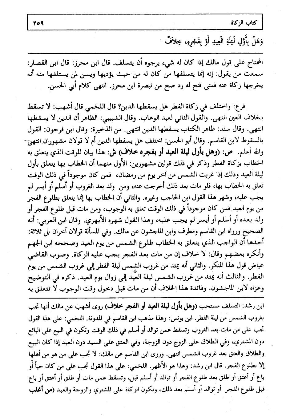 فرع: واختلف في زكاة الفطر هل يسقطها الدين قال اللخمي: قال أشهب: لا تسقط بخلاف العين انتهى. والقول الثاني لعبد الوهاب وقال الشبيبي الظاهر أن الدين لا يسقطها انتهى. وقال سند ظاهر الكتاب يسقطها الدين انتهى. من الذخيرة وقال ابن فرحون القول بالسقوط لابن القاسم وقال أبو الحسن اختلف هل يسقطها الدين أم لا قولان مشهوران انتهى. والله أعلم. ص: "وهل بأول ليلة العيد أو بفجره خلاف". ش: هذا بيان للوقت الذي يتعلق به الخطاب بزكاة الفطر وذكر في ذلك قولين مشهورين الأول منهما أن الخطاب بها يتعلق بأول ليلة العيد وذلك إذا غربت الشمس من آخر يوم من رمضان فمن كان موجودا في ذلك الوقت تعلق به الخطاب بها فلو مات بعد ذلك أخرجت عنه ومن ولد بعد الغروب أو أسلم أو أيسر لم يجب عليه وشهر هذا القول ابن الحاجب وغيره والثاني أن الخطاب بها إنما يتعلق بطلوع الفجر من يوم العيد فمن كان موجودا في ذلك الوقت تعلق به الوجوب ومن مات قبل طلوع الفجر أو ولد بعده أو أسلم أو أيسر لم يجب عليه وهذا القول شهره الأبهري وقال ابن العربي أنه الصحيح ورواه ابن القاسم ومطرف وابن الماجشون عن مالك وفي المسألة قولان آخران بل ثلاثة أحدها أن الواجب الذي يتعلق به الخطاب طلوع الشمس من يوم العيد وصححه ابن الجهم وأنكره بعضهم وقال لا خلاف إن من مات بعد الفجر يجب عليه الزكاة وصوب القاضي عياض قول هذا المنكر والثاني أنه يمتد من غروب الشمس ليلة الفطر إلى غروب الشمس من يوم الفطر والثالث أنه يمتد من غروب الشمس ليلة العيد إلى زوال يوم العيد ذكره في التوضيح وعزاه لابن الماجشون وفائدة هذا الخلاف أن من مات قبل دخول وقت الوجوب لا تتعلق به