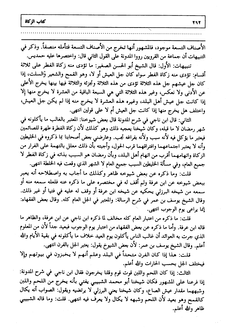 قلت: ما ذكره من اعتبار العام كله مخالف لما ذكره ابن ناجي عن ابن عرفة والظاهر ما قاله ابن عرفة وأما ما ذكره عن بعض الفقهاء من اعتبار يوم الوجوب فبعيد جدا لأن من المعلوم الذي جرت به العوائد أن غالب الناس يأكلون يوم العيد خلاف ما يأكلونه في بقية الأيام والله أعلم. وقال الشيخ يوسف بن عمر لأن بعض الشيوخ يقول يعتبر الجل بالفرن انتهى.