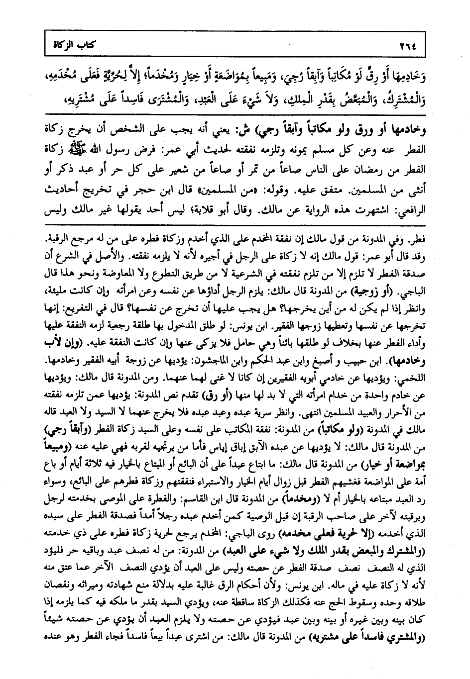 وخادمها أو رق ولو مكاتبا وآبقا رجي". ش: يعني أنه يجب على الشخص أن يخرج زكاة الفطر عنه وعن كل مسلم يمونه وتلزمه نفقته لحديث ابن عمر فرض رسول الله صلى الله عليه وسلم زكاة الفطر من رمضان على الناس صاعا من تمر أو صاعا من شعير على كل حر أو عبد ذكر أو أنثى من المسلمين متفق عليه وقوله من المسلمين قال ابن حجر في تخريج أحاديث الرافعي اشتهرت هذه الرواية عن مالك وقال أبو قلابة ليس أحد يقولها غير مالك وليس
