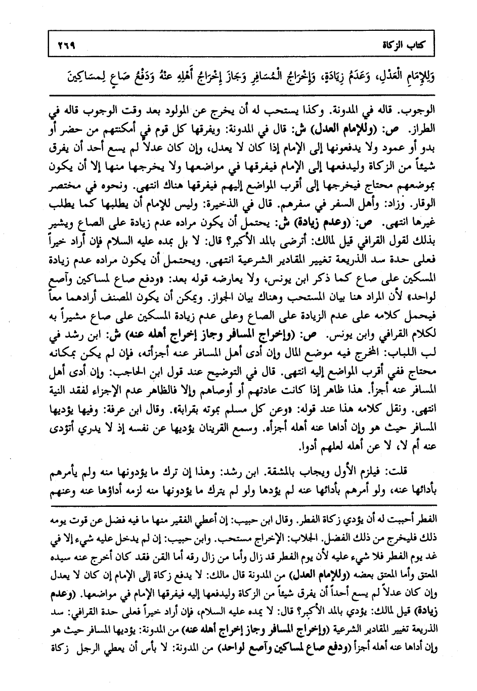 الوجوب قاله في المدونة وكذا يستحب له أن يخرج عن المولود بعد وقت الوجوب قاله في الطراز. ص: "وللإمام العدل". ش: قال في المدونة ويفرقها كل قوم في أمكنتهم من حضر أو بدو أو عمود ولا يدفعونها إلى الإمام إذا كان لا يعدل وإن كان عدلا لم يسع أحد أن يفرق شيئا من الزكاة وليدفعها إلى الإمام فيفرقها في مواضعها ولا يخرجها منها إلا أن يكون بموضعهم محتاج فيخرجها إلى أقرب المواضع إليهم فيفرقها هناك انتهى. ونحوه في مختصر الوقار وزاد وأهل السفر في سفرهم قال في الذخيرة: وليس للإمام أن يطلبها كما يطلب غيرها انتهى. ص: "وعدم زيادة". ش: يحتمل أن يكون مراده عدم زيادة على الصاع ويشير بذلك لقول القرافيقيل لمالك أترضى قال لا بل بمده عليه السلام فإن أراد خيرا فعلى حدة سد الذريعة تغيير المقادير الشرعية انتهى. ويحتمل أن يكون مراده عدم زيادة المسكين على صاع كما ذكر ابن يونس ولا يعارضه قوله: بعد ودفع صاع لمساكين وآصع لواحد لأن المراد هنا بيان المستحب وهناك بيان الجواز ويمكن أن يكون المصنف أرادهما معا فيحمل كلامه على عدم الزيادة على الصاع وعلى عدم زيادة المسكين على صاع مشيرا به لكلام القرافي وابن يونس. ص: "وإخراج المسافر وجاز إخراج أهله عنه". ش: ابن رشد في لب اللباب المخرج فيه موضع المال وإن أدى أهل المسافر عنه أجزأته فإن لم يكن بمكانه محتاج ففي أقرب المواضع إليه انتهى. قال في التوضيح: ثم قول ابن الحاجب وإن أدى أهل المسافر عنه أجزأ هذا ظاهر إذا كانت عادتهم أو أوصاهم وإلا فالظاهر عدم الاجزاء لفقد النية انتهى. ونقل كلامه هذا ثم قوله: وعن كل مسلم بموته بقرابة وقال ابن عرفة: وفيها يؤديها المسافر حيث هو وإن أداها عنه أهله أجزأه وسمع القرينان يؤديها عن نفسه إذ لا يدري أتؤدى عنه أم لا لا عن أهله لعلهم أدوا.