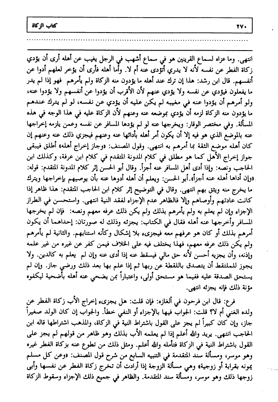 فرع: قال ابن فرحون في ألغازه: فإن قلت: هل يجزئ إخراج الأب زكاة الفطر عن ولده الغني أم لا قلت: الجواب فيها بالاجزاء أو النفي خطأ والجواب إن كان الولد صغيرا جاز وإن كان كبيرا لم يجز على القول باشتراط النية في الزكاة والمذهب اشتراطها قاله ابن الحاجب انتهى. يريد والله أعلم. إذا لم يعلمه الأب بذلك وهو ظاهر من قولهم لم يجز على القول باشتراط النية في الزكاة فتأمله والله أعلم. ومثل ذلك من تطوع عنه بزكاة الفطر غيره وهو موسر ومسألة في التنبيه السابع من شرح قول المصنف وعن كل مسلم يمونه بقرابة أو زوجية وهي مسألة الزوجة إذا أرادت أن تخرج زكاة الفطر عن نفسها وأبى زوجها ذلك وهو موسر ومسألة والظاهر في جميع ذلك الاجزاء وسقوط الزكاة