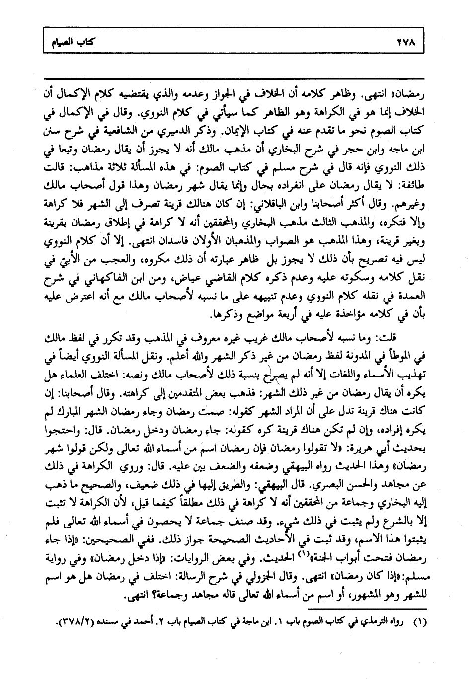 رمضان" انتهى. وظاهر كلامه أن الخلاف في الجواز وعدمه والذي يقتضيه كلام الإكمال أن الخلاف إنما هو في الكراهة وهو الظاهر كما سيأتي في كلام النووي وقال في الإكمال في كتاب الصوم نحو ما تقدم عنه في كتاب الإيمان وذكر الدميري من الشافعية في شرح سنن ابن ماجه وابن حجر في شرح البخاري أن مذهب مالك أنه لا يجوز أن يقال رمضان وتبعا في ذلك النووي فإنه قال في شرح مسلم في كتاب الصوم في هذه المسألة ثلاثة مذاهب قالت طائفة لا يقال رمضان على انفراده بحال وإنما يقال شهر رمضان وهذا قول أصحاب مالك وغيرهم وقال أكثر أصحابنا وابن الباقلاني إن كان هنالك قرينة تصرف إلى الشهر فلا كراهة وإلا فتكره والمذهب الثالث مذهب البخاري والمحققين أنه لا كراهة في إطلاق رمضانبقرينة وبغير قرينة وهذا المذهب هو الصواب والمذهبان الأولان فاسدان انتهى. إلا أن كلام النووي ليس فيه لبعض بأن ذلك لا يجوز بل ظاهر عبارته أن ذلك مكروه والعجب من الأبي في نقل كلامه وسكوته عليه وعدم ذكره كلام القاضي عياض ومن ابن الفاكهاني في شرح العمدة في نقله كلام النووي وعدم تنبيهه على ما نسبه لأصحاب مالك مع أنه اعترض عليه بأن في كلامه مؤاخذة عليه في أربعة مواضع وذكرها.