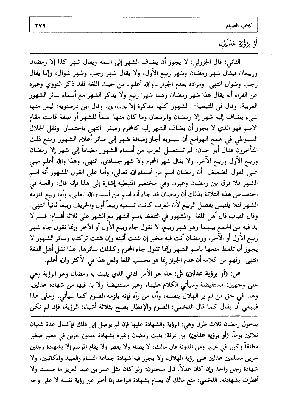 ص: "أو برؤية عدلين". ش: هذا هو الأمر الثاني الذي يثبت به رمضان وهو الرؤية وهي على وجهين مستفيضة وسيأتي الكلام عليها وغير مستفيضة ولا بد فيها من شهادة عدلين وهذا في حق من لم ير الهلال بنفسه وأما من رآه فإنه يلزمه الصوم كما سيأتي وعلى هذا فينبغي أن يقال كما قال اللخمي: الصوم والإفطار يصح بثلاثة أشياء الرؤية فإن لم تكن