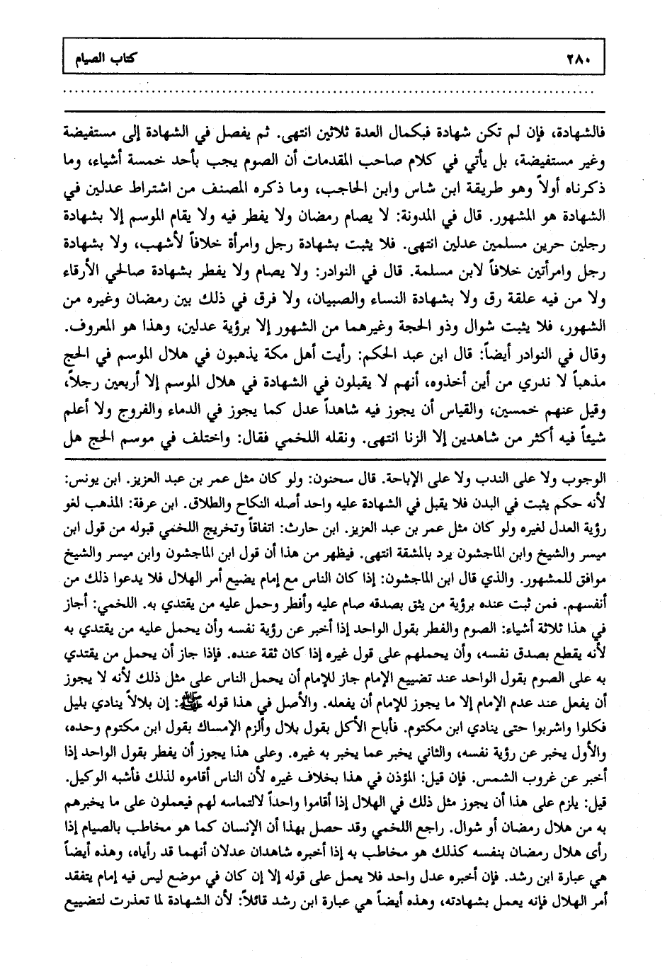 فالشهادة فإن لم تكن شهادة فبكمال العدة ثلاثين انتهى. ثم يفصل في الشهادة إلى مستفيضة وغير مستفيضة بل يأتي في كلام صاحب المقدمات أن الصوم يجب بأحد خمسة أشياء وما ذكرناه أولا وهو طريقة ابن شاس وابن الحاجب وما ذكره المصنف من اشتراط عدلين في الشهادة هو المشهور قال في المدونة لا يصام رمضان ولا يفطر فيه ولا يقام الموسم إلا بشهادة رجلين حرين مسلمين عدلين انتهى. فلا يثبت بشهادة رجل وامرأة خلافا لأشهب ولا بشهادة رجل وامرأتين خلافا لابن مسلمة قال في النوادر ولا يصام ولا يفطر بشهادة صالحي الأرقاء ولا من فيه علقة رق ولا بشهادة النساء والصبيان ولا فرق في ذلك بين رمضان وغيره من الشهور فلا يثبت شوال وذو الحجة وغيرهما من الشهور إلا برؤية عدلين وهذا هو المعروف وقال في النوادر أيضا قال ابن عبد الحكم: رأيت أهل مكة يذهبون في هلال الموسم في الحج مذهبا لا ندري من أين أخذوه أنهم لا يقبلون في الشهادة في هلال الموسم إلا أربعين رجلا وقيل عنهم خمسين والقياس أن يجوز فيه شاهدا عدل كما يجوز في الدماء والفروج ولا أعلم شيئا فيه أكثر من شاهدين إلا الزنا انتهى. ونقله اللخمي فقال واختلف في موسم الحج هل