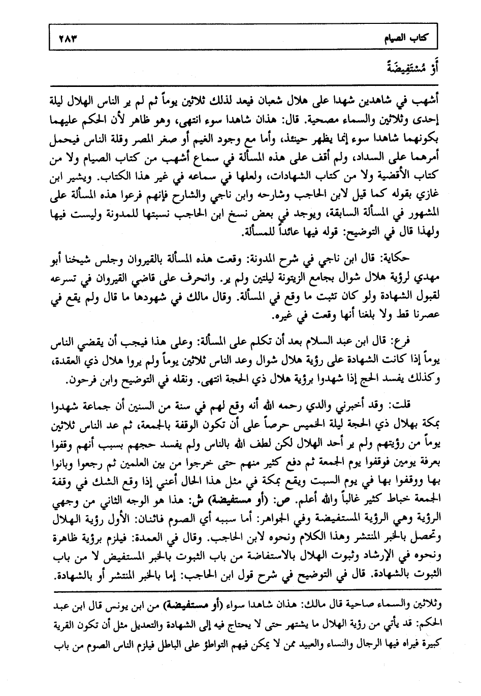 قلت: وقد أخبرني والدي رحمه الله أنه وقع لهم في سنة من السنين أن جماعة شهدوا بمكة بهلال ذي الحجة ليلة الخميس حرصا على أن تكون الوقفة بالجمعة ثم عد الناس ثلاثين يوما من رؤيتهم ولم ير أحد الهلال لكن لطف الله بالناس ولم يفسد حجهم بسبب أنهم وقفوا بعرفة يومين فوقفوا يوم الجمعة ثم دفع كثير منهم حتى خرجوا من بين العلمين ثم رجعوا وبانوا بها ووقفوا بها في يوم السبت ويقع بمكة في مثل هذا الحال أعني إذا وقع الشك في وقفة الجمعة خباط كثير غالبا والله أعلم. ص: "أو مستفيضة". ش: هذا هو الوجه الثاني من وجهي الرؤية وهي الرؤية المستفيضة وفي الجواهر أما سببه أي الصوم فاثنان الأول رؤية الهلال وتحصل بالخبر المنتشر وهذا الكلام ونحوه لابن الحاجب وقال في العمدة فيلزم برؤية ظاهرة ونحوه في الإرشاد وثبوت الهلال بالاستفاضة من باب الثبوت بالخبر المستفيض لا من باب الثبوت بالشهادة قال في التوضيح: في شرح قول ابن الحاجب إما بالخبر المنتشر أو بالشهادة
