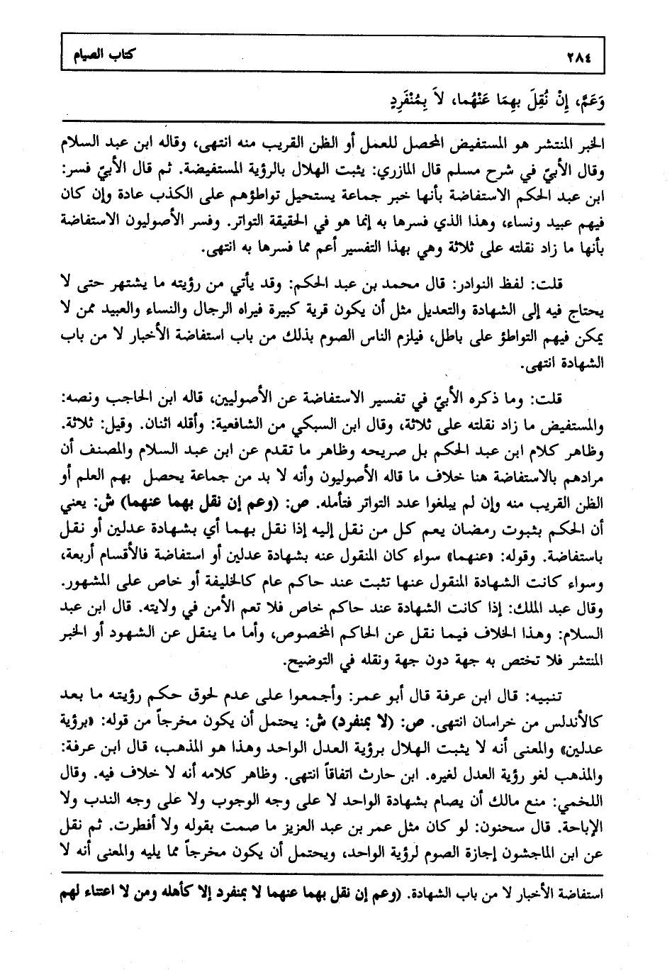قلت: لفظ النوادر قال محمد بن عبد الحكم وقد يأتي من رؤيته ما يشتهر حتى لا يحتاج فيه إلى الشهادة والتعديل مثل أن يكون قرية كبيرة فيراه الرجال والنساء والعبيد ممن لا يمكن فيهم التواطؤ على باطل فيلزم الناس الصوم بذلك من باب استفاضة الأخبار لا من باب الشهادة انتهى.