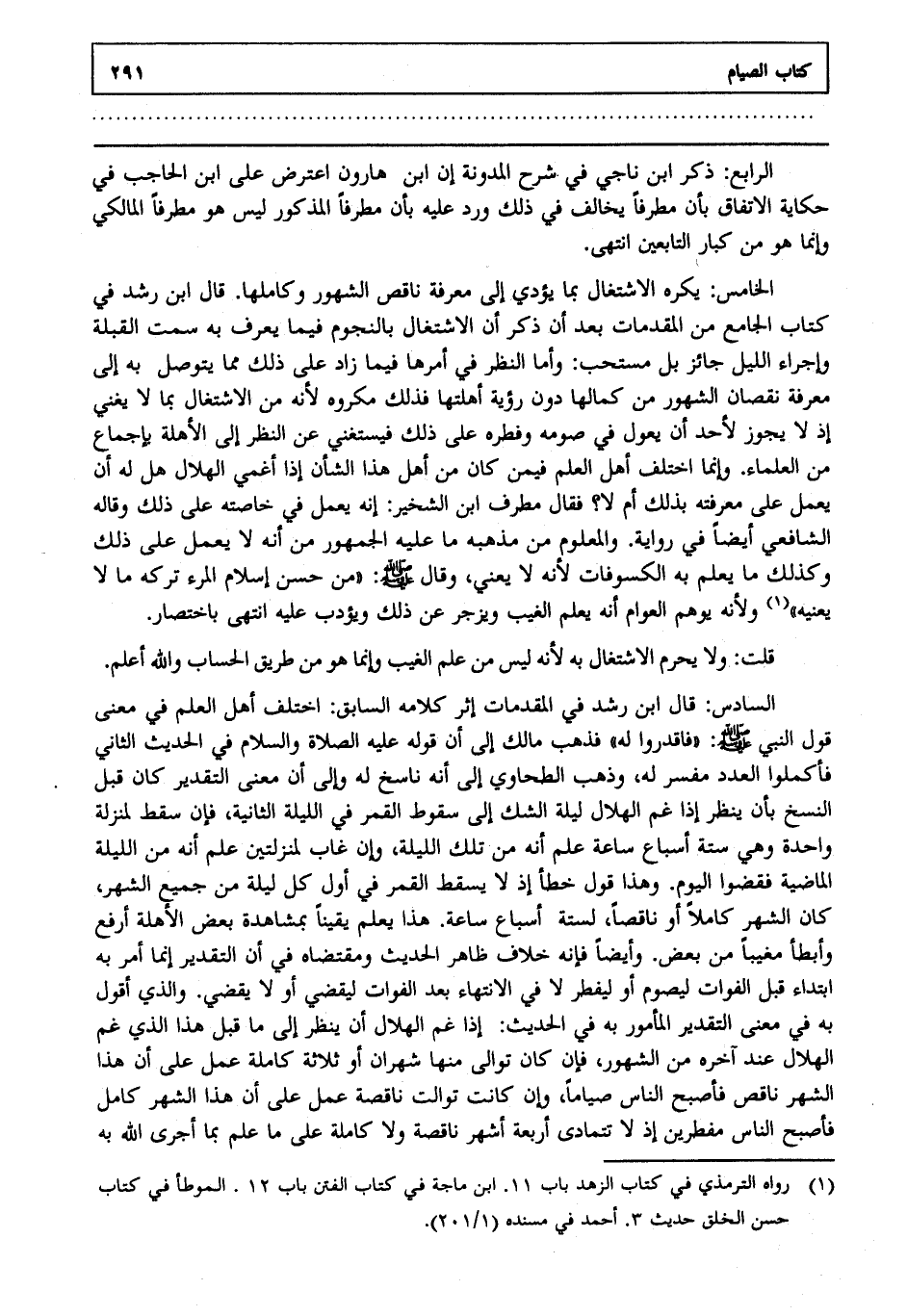 الرابع ذكر ابن ناجي في شرح المدونة إن ابن هارون اعترض على ابن الحاجب في حكاية الاتفاق بأن مطرفا يخالف في ذلك ورد عليه بأن مطرفا المذكور ليس هو مطرفا المالكي وإنما هو من كبار التابعين انتهى. الخامس: يكره الاشتغال بما يؤدي إلى معرفة ناقص الشهور وكاملها قال ابن رشد في كتاب الجامع من المقدمات بعد أن ذكر أن الاشتغال بالنجوم فيما يعرف به سمت القبلة وإجراء الليل جائز بل مستحب: وأما النظر في أمرها فيما زاد على ذلك مما يتوصل به إلى معرفة نقصان الشهور من كمالها دون رؤية أهلتها فذلك مكروه لأنه من الاشتغال بما لا يغني إذ لا يجوز لأحد أن يعول في صومه وفطره على ذلك فيستغني عن النظر إلى الأهلة بإجماع من العلماء وإنما اختلف أهل العلم فيمن كان من أهل هذا الشأن إذا أغمي الهلال هل له أن يعمل على معرفته بذلك أم لا فقال مطرف ابن الشخير إنه يعمل في خاصته على ذلك وقاله الشافعي أيضا في رواية والمعلوم من مذهبه ما عليه الجمهور من أنه لا يعمل على ذلك وكذلك ما يعلم به الكسوفات لأنه لا يعني وقال صلى الله عليه وسلم: "من حسن إسلام المرء تركه ما لا يعنيه" 1 ولأنه يوهم العوام أنه يعلم الغيب ويزجر عن ذلك ويؤدب عليه انتهى. باختصار.