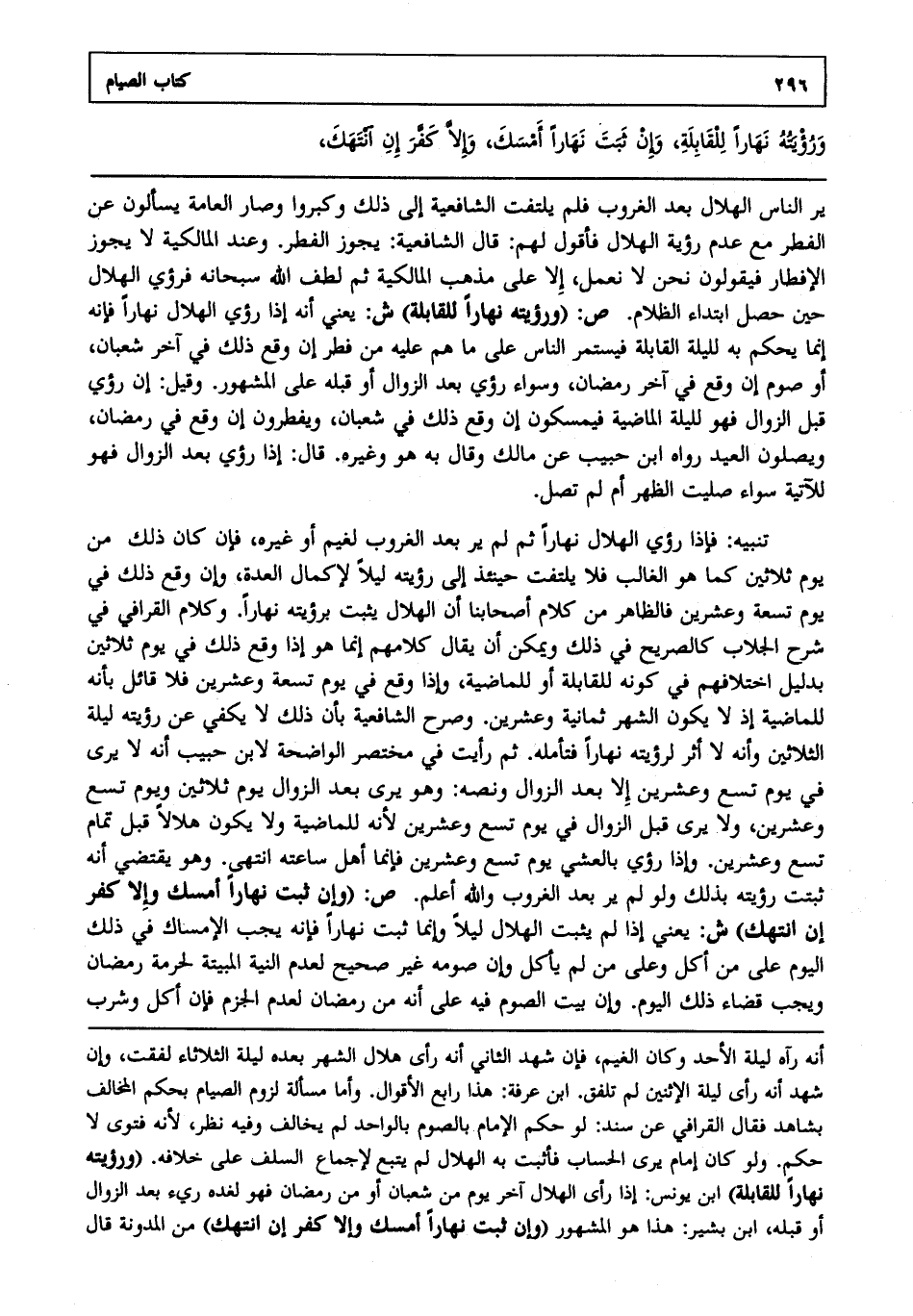 ير الناس الهلال بعد الغروب فلم يلتفت الشافعية إلى ذلك وكبروا وصار العامة يسألون عن الفطر مع عدم رؤية الهلال فأقول لهم قال الشافعية يجوز الفطر وعند المالكية لا يجوز الإفطار فيقولون نحن لا نعمل إلا على مذهب المالكية ثم لطف الله سبحانه فرؤي الهلال حين حصل ابتداء الظلام. ص: "ورؤيته نهارا للقابلة". ش: يعني أنه إذا رؤي الهلال نهارا فإنه إنما يحكم به لليلة القابلة فيستمر الناس على ما هم عليه من فطر إن وقع ذلك في آخر شعبان أو صوم إن وقع في آخر رمضان وسواء رؤي بعد الزوال أو قبله على المشهور وقيل إن رؤي قبل الزوال فهو لليلة الماضية فيمسكون إن وقع ذلك في شعبان ويفطرون إن وقع في رمضان ويصلون العيد رواه ابن حبيب عن مالك وقال به هو وغيره قال إذا رؤي بعد الزوال فهو للآتية سواء صليت الظهر أم لم تصل.