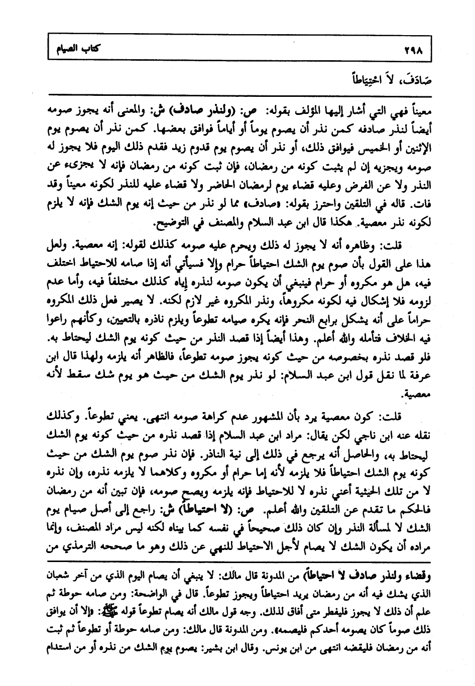 قلت: وظاهره أنه لا يجوز له ذلك ويحرم عليه صومه كذلك لقوله إنه معصية ولعل هذا على القول بأن صوم يوم الشك احتياطا حرام وإلا فسيأتي أنه إذا صامه للاحتياط اختلف فيه هل هو مكروه أو حرام فينبغي أن يكون صومه لنذره إياه كذلك مختلفا فيه وأما عدم لزومه فلا إشكال فيه لكونه مكروها ونذر المكروه غير لازم لكنه لا يصير فعل ذلك المكروه حراما على أنه يشكل برابع النحر فإنه يكره صيامه تطوعا ويلزم ناذره بالتعيين وكأنهم راعوا فيه الخلاف فتأمله والله أعلم. وهذا أيضا إذا قصد النذر من حيث كونه يوم الشك ليحتاط به فلو قصد نذره بخصوصه من حيث كونه يجوز صومه تطوعا فالظاهر أنه يلزمه ولهذا قال ابن عرفة لما نقل قول ابن عبد السلام: لو نذر يوم الشك من حيث هو يوم شك سقط لأنه معصية.