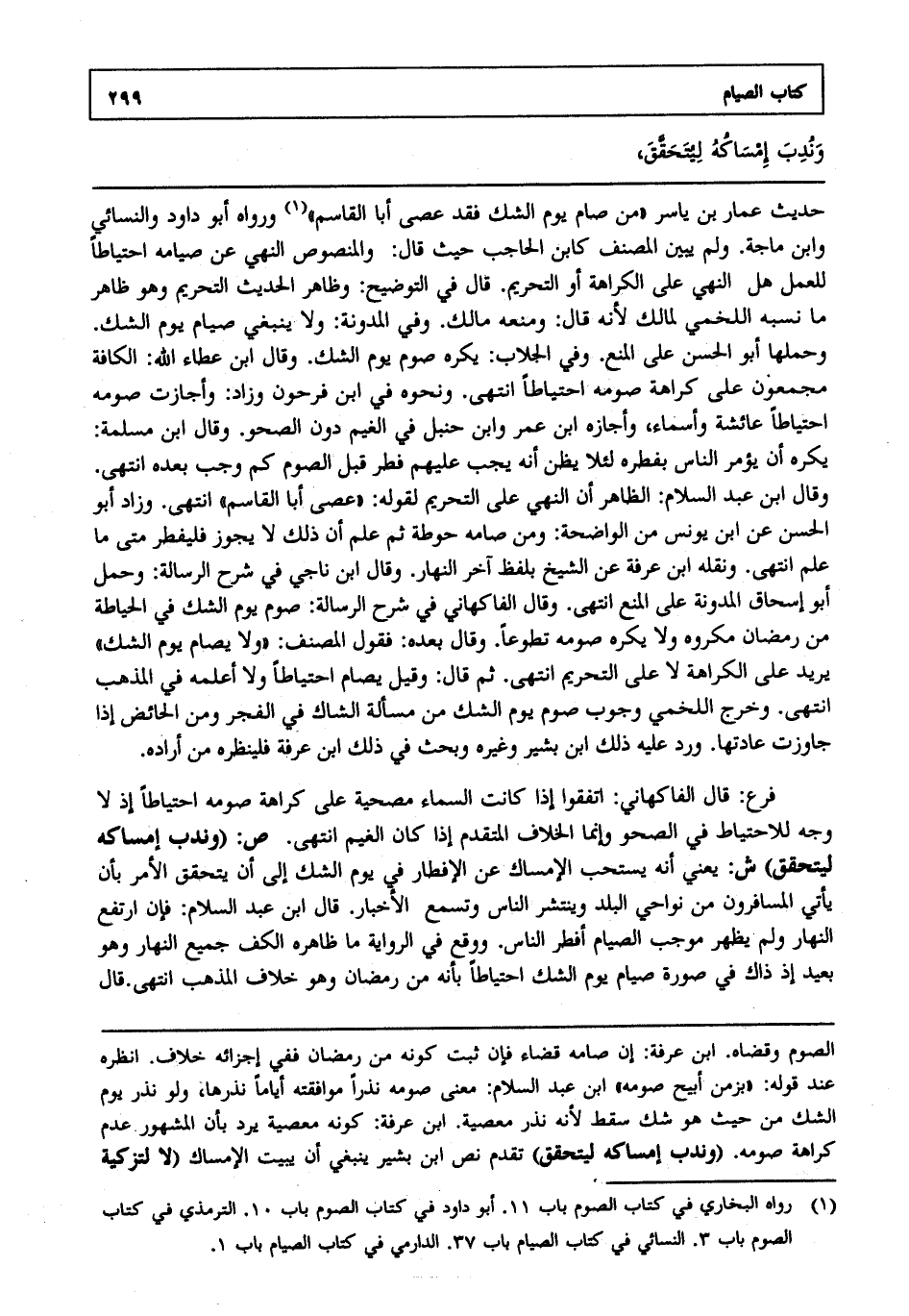 حديث عمار بن ياسر "من صام يوم الشك فقد عصى أبا القاسم"1 ورواه أبو داود والنسائي وابن ماجة ولم يبين المصنف كابن الحاجب حيث قال والمنصوص النهي عن صيامه احتياطا للعمل هل النهي على الكراهة أو التحريم قال في التوضيح: وظاهر الحديث التحريم وهو ظاهر ما نسبه اللخمي لمالك لأنه قال ومنعه مالك وفي المدونة ولا ينبغي صيام يوم الشك وحملها أبو الحسن على المنع وفي الجلاب يكره صوم يوم الشك وقال ابن عطاء الله الكافة مجمعون على كراهة صومه احتياطا انتهى. ونحوه في ابن فرحون وزاد وأجازت صومه احتياطا عائشة وأسماء وأجازه ابن عمر وابن حنبل في الغيم دون الصحو وقال ابن مسلمة يكره أن يؤمر الناس بفطره لئلا يظن أنه يجب عليهم فطر قبل الصوم كما وجب بعده انتهى. وقال ابن عبد السلام الظاهر أن النهي على التحريم لقوله عصى أبا القاسم انتهى. وزاد أبو الحسن عن ابن يونس من الواضحة ومن صامه حوطة ثم علم أن ذلك لا يجوز فليفطر متى ما علم انتهى. ونقله ابن عرفة عن الشيخ بلفظ آخر النهار وقال ابن ناجي في شرح الرسالة وحمل أبو إسحاق المدونة على المنع انتهى. وقال الفاكهاني في شرح الرسالة صوم يوم الشك في الحياطة من رمضان مكروه ولا يكره صومه تطوعا وقال بعده فقول المصنف ولا يصام يوم الشك يريد على الكراهة لا على التحريم انتهى. ثم قال وقيل يصام احتياطا ولا أعلمه في المذهب انتهى. وخرج اللخمي وجوب صوم يوم الشك من مسألة الشاك في الفجر ومن الحائض إذا جاوزت عادتها ورد عليه ذلك ابن بشير وغيره وبحث في ذلك ابن عرفة فلينظره من أراده.
