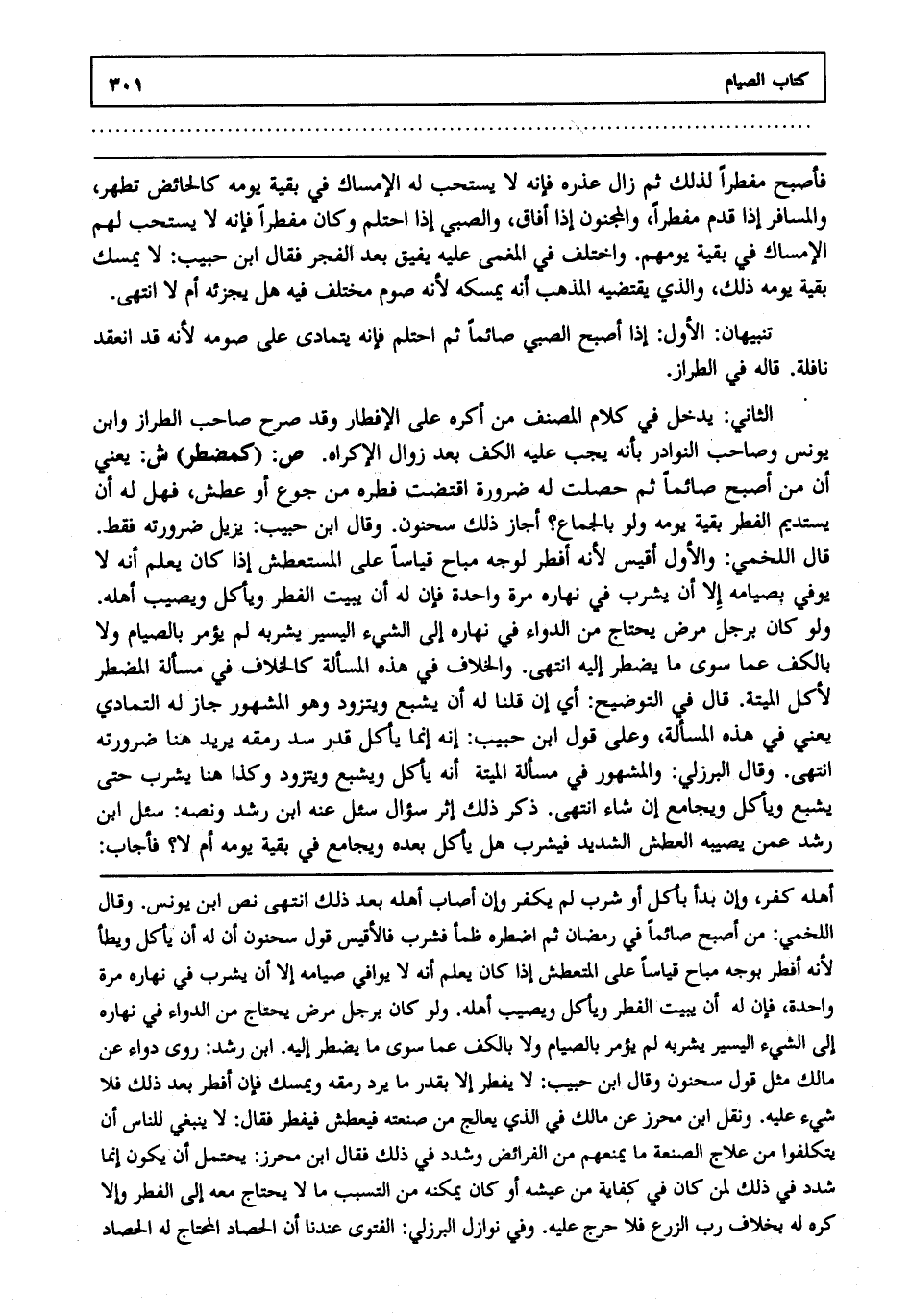 تنبيهان: الأول: إذا أصبح الصبي صائما ثم احتلم فإنه يتمادى على صومه لأنه قد انعقد نافلة قاله في الطراز. الثاني: يدخل في كلام المصنف من أكره على الإفطار وقد صرح صاحب الطراز وابن يونس وصاحب النوادر بأنه يجب عليه الكف بعد زوال الإكراه. ص: "كمضطر". ش: يعني أن من أصبح صائما ثم حصلت له ضرورة اقتضت فطره من جوع أو عطش فهل له أن يستديم الفطر بقية يومه ولو بالجماع أجاز ذلك سحنون وقال ابن حبيب: يزيل ضرورته فقط قال اللخمي: والأول أقيس لأنه أفطر لوجه مباح قياسا على المستعطش إذا كان يعلم أنه لا يوفي بصيامه إلا أن يشرب في نهاره مرة واحدة فإن له أن يبيت الفطر ويأكل ويصيب أهله ولو كان برجل مرض يحتاج من الدواء في نهاره إلى الشيء اليسير يشربه لم يؤمر بالصيام ولا بالكف عما سوى ما يضطر إليه انتهى. والخلاف في هذه المسألة كالخلاف في مسألة المضطر لأكل الميتة قال في التوضيح: أي إن قلنا له أن يشبع ويتزود وهو المشهور جاز له التمادي يعني في هذه المسألة وعلى قول ابن حبيب إنه إنما يأكل قدر سد رمقه يريد هنا ضرورته انتهى. وقال البرزلي: والمشهور في مسألة الميتة أنه يأكل ويشبع ويتزود وكذا هنا يشرب حتى يشبع ويأكل ويجامع إن شاء انتهى. ذكر ذلك إثر سؤال سئل عنه ابن رشد ونصه سئل ابن رشد عمن يصيبه العطش الشديد فيشرب هل يأكل بعده ويجامع في بقية يومه أم لا فأجاب: