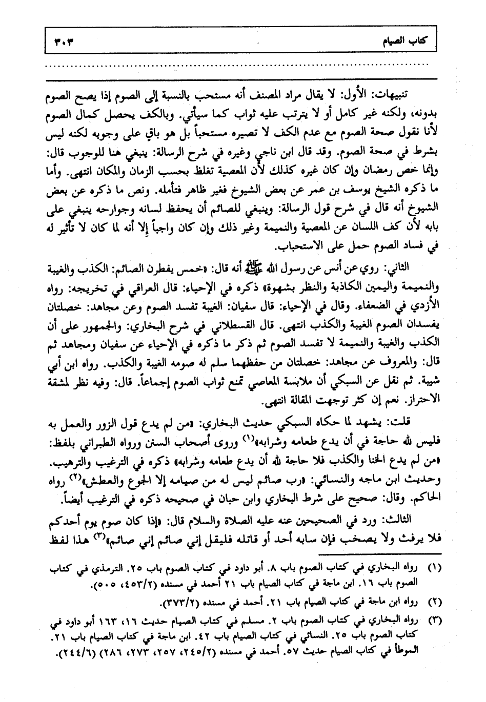 3 رواه البخاري في كتاب الصوم باب 2. مسلم في كتاب الصيام حديث 16، 163. أبو داود في كتاب الصوم باب 25. النسائي في كتاب الصيام باب 42. ابن ماجة في كتاب الصيام باب 21. الموطأ في كتاب الصيام حديث 57. أحمد في مسنده (2/245، 257، 273، 286) (6/244).