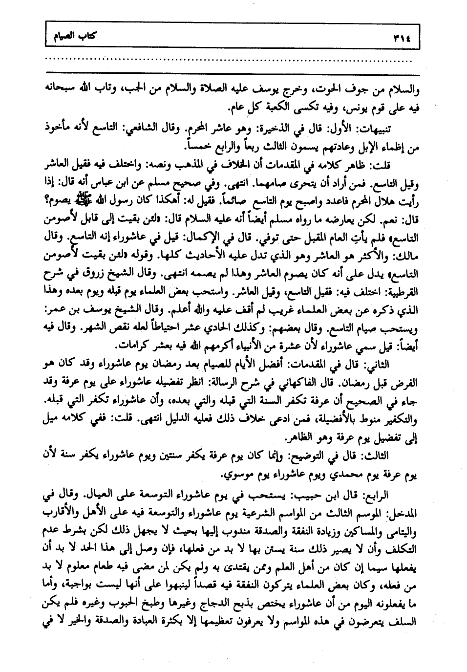 الرابع: قال ابن حبيب: يستحب في يوم عاشوراء التوسعة على العيال وقال في المدخل الموسم الثالث من المواسم الشرعية يوم عاشوراء والتوسعة فيه على الأهل والأقارب واليتامى والمساكين وزيادة النفقة والصدقة مندوب إليها بحيث لا يجهل ذلك لكن بشرط عدم التكلف وأن لا يصير ذلك سنة يستن بها لا بد من فعلها فإن وصل إلى هذا الحد لا بد أن يفعلها سيما إن كان من أهل العلم وممن يقتدى به ولم يكن لمن مضى فيه طعام معلوم لا بد من فعله وكان بعض العلماء يتركون النفقة فيه قصدا لينبهوا على أنها ليست بواجبة وأما ما يفعلونه اليوم من أن عاشوراء يختص بذبح الدجاج وغيرها وطبخ الحبوب وغيره فلم يكن السلف يتعرضون في هذه المواسم ولا يعرفون تعظيمها إلا بكثرة العبادة والصدقة والخير لا في