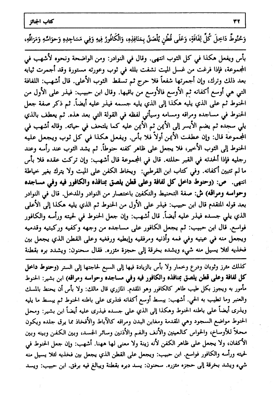 بأس ويفعل هكذا في كل الثوب انتهى. وقال في النوادر ومن الواضحة ونحوه لأشهب في المجموعة فإذا فرغت من غسل الميت نشفت بلله في ثوب وعورته مستورة وقد أجمرت ثيابه بعد ذلك وترك وإن أجمرتها شفعا فلا حرج ثم تسقط الثوب الأعلى قال أشهب: اللفافة التي هي أوسع أكفانه عند ال أوسع فالأوسع من باقيها وقال ابن حبيب: فيذر على الأول من الحنوط ثم على الذي يليه هكذا إلى الذي يليه جسمه فيذر عليه أيضا ثم ذكر صفة جعل الحنوط في مساجده ومراقه ومسامه وسيأتي لفظه في القولة التي بعد هذه ثم يعطف بالذي يلي جسده ثم يضم الأيسر إلى الأيمن عند ال أيمن عليه كما يلتحف في حياته وقاله أشهب في المجموعة قال وإن عطفت الأيمن أولا فلا بأس ويفعل هكذا في كل ثوب ويجعل عليه الحنوط إلى الثوب الأخير فلا يجعل على ظاهر كفنه حنوطا ثم يشد الثوب عند رأسه وعند رجليه فإذا ألحدته في القبر حللته قال في المجموعة: قال أشهب: وإن تركت عقده فلا بأس ما لم تتبين أكفانه وفي كتاب ابن القرطبي ويخاط الكفن على الميت ولا يترك بغير خياطة انتهى. ص: "وحنوط داخل كل لفافة وعلى قطن يلصق بمنافذه والكافور فيه وفي مساجده وحواسه ومراقه". ش: صفة التحنيط والتكفين باختصار من النوادر والمدخل قال في النوادر بعد قوله المتقدم قال ابن حبيب: فيذر على الأول من الحنوط عند ال ذي يليه هكذا إلى الأعلى الذي يلي جسده فيذر عليه أيضا قال أشهب: وإن جعل الحنوط في لحيته ورأسه والكافور فواسع قال ابن حبيب: ثم يجعل الكافور على مساجده من وجهه وكفيه وركبتيه وقدميه ويجعل منه في عينيه وفي فمه وأذنيه ومرفقيه وإبطيه ورفغيه وعلى القطن الذي يجعل بين فخذيه لئلا يسيل منه شيء ويشده بخرقة إلى حجزة مئزره فقال سحنون ويشدد بره بقطنة