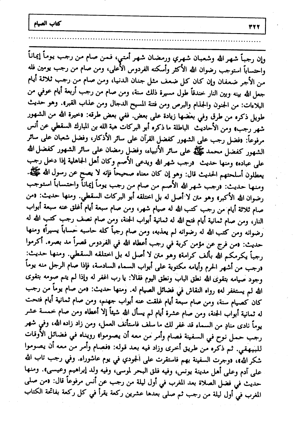 وإن رجبا شهر الله وشعبان شهري ورمضان شهر أمتي فمن صام من رجب يوما إيمانا واحتسابا استوجب رضوان الله الأكثر وأسكنه الفردوس الأعلى ومن صام من رجب يومين فله من الأجر ضعفان وإن كان كل ضعف مثل جنان الدنيا ومن صام من رجب ثلاثة أيام جعل الله بينه وبين النار خندقا طول مسيرة ذلك سنة ومن صام من رجب أربعة أيام عوفي من البلاءات من الجنون والجذام والبرص ومن فتنة المسيح الدجال ومن عذاب القب ر " وهو حديث طويل ذكره من طرق وفي بعضها زيادة على بعض ففي بعض طرقه خيرة الله من الشهور شهر رجب ومن الأحاديث الباطلة ما ذكره أبو البركات هبة الله بن المبارك السقطي عن أنس مرفوعا فضل رجب على الشهور كفضل القرآن على سائر الأذكار وفضل شعبان على سائر الشهور كفضل محمد صلى الله عليه وسلم على سائر الأنبياء وفضل رمضان على سائر الشهور كفضل الله على عباده ومنها حديث رجب شهر الله ويدعى الأصم وكان أهل الجاهلية إذا دخل رجب يعطلون أسلحتهم الحديث قال وهو إن كان معناه صحيحا فإنه لا يصح عن رسول الله صلى الله عليه وسلم ومنها حديث رجب شهر الله الأصم من صام من رجب يوما إيمانا واحتسابا استوجب رضوان الله الأكبر وهو متن لا أصل له بل اختلقه أبو البركات السقطي ومنها حديث من صام ثلاثة أيام من رجب كتب الله له صيام شهر ومن صام سبعة أيام أغلق عنه سبعة أبواب النار ومن صام ثمانية أيام فتح الله له ثمانية أبواب الجنة ومن صام نصف رجب كتب الله له رضوانه ومن كتب الله له رضوانه لم يعذبه ومن صام رجبا كله حاسبه حسابا يسيرا ومنها حديث من فرج عن مؤمن كربة في رجب أعطاه الله في الفردوس قصرا مد بصره أكرموا رجبا يكرمكم الله بألف كرامة وهو متن لا أصل له بل اختلقه السقطي ومنها حديث رجب من أشهر الحرم وأيامه مكتوبة على أبواب السماء السادسة فإذا صام الرجل منه يوما وجود صيامه بتقوى الله نطق الباب ونطق اليوم فقالا يا رب اغفر له وإذا لم يتم صومه بتقوى الله لم يستغفر له رواه النقاش في فضائل الصيام له ومنها حديث من صام يوما من رجب كان كصيام سنة ومن صام سبعة أيام غلقت عنه أبواب جهنم ومن صام ثمانية أيام فتحت له ثمانية أبواب الجنة ومن صام عشرة أيام لم يسأل الله شيئا إلا أعطاه ومن صام خمسة عشر يوما نادى مناد من السماء قد غفر لك ما سلف فاستأنف العمل ومن زاد زاده الله وفي شهر رجب حمل نوح في السفينة فصام وأمر من معه أن يصوموا رويناه في فضائل الأوقات للبيهقي ثم ذكره من طريق أخرى وزاد فيه بعد قوله: فصام وأمر من معه أن يصوموا شكراً لله وجرت السفينة بهم فاستقرت على الجودي في يوم عاشوراء وفي رجب تاب الله على آدم وعلى أهل مدينة يونس وفيه فلق البحر لموسى وفيه ولد إبراهيم وعيسى ومنها حديث في فضل الصلاة بعد المغرب في أول ليلة من رجب عن أنس مرفوعا قال من صلى المغرب في أول ليلة من رجب ثم صلى بعدها عشرين ركعة يقرأ في كل ركعة بفاتحة الكتاب