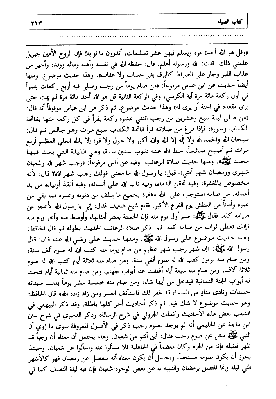 وقل هو الله أحد عشر مرة ويسلم فيهن عشر تسليمات أتدرون ما ثوابه فإن الروح الأمين جبريل علمني ذلك قلت: الله ورسوله أعلم قال حفظه الله في نفسه وأهله وماله وولده وأجير من عذاب القبر وجاز على الصراط كالبرق بغير حساب ولا عقاب وهذا حديث موضوع ومنها أيضا حديث عن ابن عباس مرفوعا من صام يوما من رجب وصلى فيه أربع ركعات يتمرأ في أول ركعة مائة مرة آية الكرسي وفي الركعة الثانية قل هو الله أحد مائة مرة لم يمت حتى يرى مقعده في الجنة أو يرى له وهذا حديث موضوع ثم ذكر عن ابن عباس موقوفا أنه قال من صلى ليلة سبع وعشرين من رجب اثنتي عشرة ركعة يقرأ في كل ركعة منها بفاتحة الكتاب وسورة فإذا فرغ من صلاته قرأ فاتحة الكتاب سبع مرات وهو جالس ثم قال سبحان الله والحمد لله ولا إله إلا الله والله أكبر ولا حول ولا قوة إلا بالله العلي العظيم أربع مرات ثم أصبح صائما حط الله عنه ذنوب ستين سنة وهي الليلة التي بعث فيها محمد صلى الله عليه وسلم ومنها حديث صلاة الرغائب وفيه عن أنس مرفوعا رجب شهر الله وشعبان شهري ورمضان شهر أمتي قيل يا رسول الله ما معنى قولك رجب شهر الله قال لأنه مخصوص بالمغفرة وفيه تحقن الدماء وفيه تاب الله على أنبيائه وفيه أنقذ أولياءه من يد أعدائه من صامه استوجب على الله مغفرة بجميع ما سلف من ذنوبه وعمره فما بقي من عمره وأمانا من العطش يوم الفزع الأكبر فقام شيخ ضعيف فقال إني يا رسول الله لأعجز عن صيامه كله فقال صلى الله عليه وسلم صم أول يوم منه فإن الحسنة بعشر أمثالها وأوسط منه وآخر يوم منه فإنك تعطى ثواب من صامه كله ثم ذكر صلاة الرغائب الحديث بطوله ثم قال الحافظ وهذا حديث موضوع على رسول الله صلى الله عليه وسلم ومنها حديث علي رضي الله عنه قال قال رسول الله صلى الله عليه وسلم إن شهر رجب شهر عظيم من صام يوما منه كتب الله له صوم ألف سنة ومن صام منه يومين كتب الله له صوم ألفي سنة ومن صام منه ثلاثة أيام كتب الله له صوم ثلاثة آلاف ومن صام منه سبعة أيام أغلقت عنه أبواب جهنم ومن صام منه ثمانية أيام حسنة له أبواب الجنة الثمانية فيدخل من أيها شاء ومن صام منه خمسة عشر يوما بدلت سيئاته حسنات ونادى مناد من السماء قد غفر لك فاستأنف العمر ومن زاد زاده الله قال الحافظ وهو حديث موضوع لا شك فيه ثم ذكر أحاديث أخر كلها باطلة وقد ذكر البيهقي في الشعب بعض هذه الأحاديث وكذلك الجزولي في شرح الرسالة وذكر الدميري في شرح سنن ابن ماجة عن الحليمي أنه لم يوجد لصوم رجب ذكر في الأصول المعروفة سوى ما روي أن النبي صلى الله عليه وسلم سئل عن صوم رجب فقال أين أنتم من شعبان وهذا يحتمل أن معناه أن رجبا قد ظهر فضله فإنه من الحرم وكان معظما في الجاهلية فلا تسألوا عنه واسألوا عن شعبان وحينئذ يجوز أن يكون صومه مستحبا ويحتمل أن يكون معناه أنه منفصل عن رمضان فهو كالأشهر التي قبله وإنما المتصل برمضان والتنبيه به عن بعض الوجوه شعبان فإن فيه ليلة النصف كما في