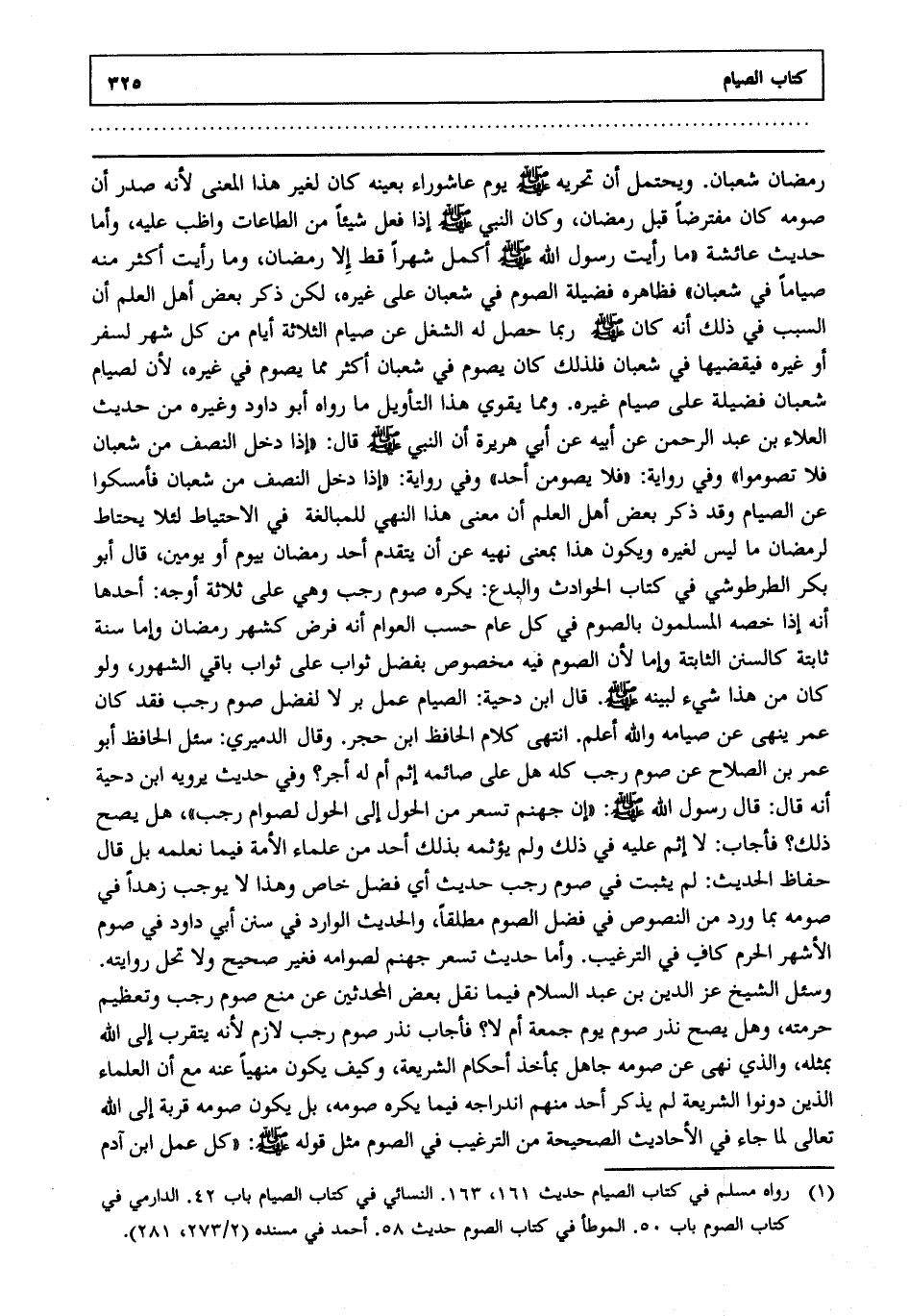 رمضان شعبان ويحتمل أن تحريه صلى الله عليه وسلم يوم عاشوراء بعينه كان لغير هذا المعنى لأنه صدر أن صومه كان مفترضا قبل رمضان وكان النبي صلى الله عليه وسلم إذا فعل شيئا من الطاعات واظب عليه وأما حديث عائشة ما رأيت رسول الله صلى الله عليه وسلم أكمل شهرا قط إلا رمضان وما رأيت أكثر منه صياما في شعبان فظاهره فضيلة الصوم في شعبان على غيره لكن ذكر بعض أهل العلم أن السبب في ذلك أنه كان صلى الله عليه وسلم ربما حصل له الشغل عن صيام الثلاثة أيام من كل شهر لسفر أو غيره فيقضيها في شعبان فلذلك كان يصوم في شعبان أكثر مما يصوم في غيره لأن لصيام شعبان فضيلة على صيام غيره ومما يقوي هذا التأويل ما رواه أبو داود وغيره من حديث العلاء بن عبد الرحمن عن أبيه عن أبي هريرة أن النبي صلى الله عليه وسلم قال " إذا دخل النصف من شعبان فلا تصوموا " وفي رواية فلا يصومن أحد وفي رواية إذا دخل النصف من شعبان فأمسكوا عن الصيام وقد ذكر بعض أهل العلم أن معنى هذا النهي للمبالغة في الاحتياط لئلا يحتاط لرمضان ما ليس لغيره ويكون هذا بمعنى نهيه عن أن يتقدم أحد رمضان بيوم أو يومين قال أبو بكر الطرطوشي في كتاب الحوادث والبدع يكره صوم رجب وهي على ثلاثة أوجه أحدها أنه إذا خصه المسلمون بالصوم في كل عام حسب العوام أنه فرض كشهر رمضان وإما سنة ثابتة كالسنن الثابتة وإما لأن الصوم فيه مخصوص بفضل ثواب على ثواب باقي الشهور ولو كان من هذا شيء لبينه صلى الله عليه وسلم قال ابن دحية الصيام عمل بر لا لفضل صوم رجب فقد كان عمر ينهى عن صيامه والله أعلم. انتهى. كلام الحافظ ابن حجر وقال الدميري سئل الحافظ أبو عمر بن الصلاح عن صوم رجب كله هل على صائمه إثم أم له أجر وفي حديث يرويه ابن دحية أنه قال قال رسول الله صلى الله عليه وسلم "إن جهنم تسعر من الحول إلى الحول لصوام رجب" هل يصح ذلك فأجاب لا إثم عليه في ذلك ولم يؤثمه بذلك أحد من علماء الأمة فيما نعلمه بل قال حفاظ الحديث لم يثبت في صوم رجب حديث أي فضل خاص وهذا لا يوجب زهدا في صومه بما ورد من النصوص في فضل الصوم مطلقا والحديث الوارد في سنن أبي داود في صوم الأشهر الحرم كاف في الترغيب وأما حديث تسعر جهنم فغير صحيح ولا تحل روايته وسئل الشيخ عز الدين بن عبد السلام فيما نقل بعض المحدثين عن منع صوم رجب وتعظيم حرمته وهل يصح نذر صوم يوم جمعة أم لا فأجاب نذر صوم رجب لازم لأنه يتقرب إلى الله بمثله والذي نهى عن صومه جاهل بمأخذ أحكام الشريعة وكيف يكون منهيا عنه مع أن العلماء الذين دونوا الشريعة لم يذكر أحد منهم اندراجه فيما يكره صومه بل يكون صومه قربة إلى الله تعالى لما جاء في الأحاديث الصحيحة من الترغيب في الصوم مثل قوله صلى الله عليه وسلم: "كل عمل ابن آدم