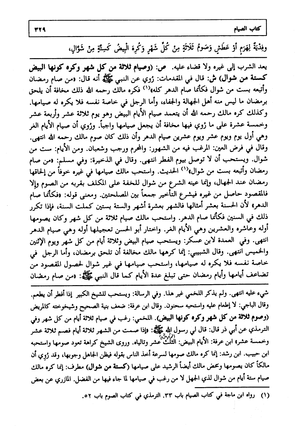 يعد الشرب إلى غيره ولا قضاء عليه. ص: "وصيام ثلاثة من كل شهر وكره كونها البيض كستة من شوال". ش: قال في المقدمات روي عن النبي صلى الله عليه وسلم أنه قال: "من صام رمضان وأتبعه بست من شوال فكأنما صام الدهر كله" 1 فكره مالك رحمه الله ذلك مخافة أن يلحق برمضان ما ليس منه أهل الجهالة والجفاء وأما الرجل في خاصة نفسه فلا يكره له صيامها وكذلك كره مالك رحمه الله أن يتعمد صيام الأيام البيض وهو يوم ثلاثة عشر وأربعة عشر وخمسة عشرة على ما روي فيها مخافة أن يجعل صيامها واجبا وروي أن صيام الأيام الغر وهي أول يوم ويوم عشر ويوم عشرين صيام الدهر وأن ذلك كان صوم مالك رحمه الله انتهى. وقال في فرض العين المرغب فيه من الشهور المحرم ورجب وشعبان ومن الأيام ست من شوال ويستحب أن لا توصل بيوم الفطر انتهى. وقال في الذخيرة: وفي مسلم من صام رمضان وأتبعه بست من شوال الحديث واستحب مالك صيامها في غيره خوفا من إلحاقها رمضان عند الجهال وإنما عينه الشرع من شوال للخفة على المكلف بقربه من الصوم وإلا فالمقصود حاصل من غيره فيشرع التأخير جمعا بين المصلحتين ومعنى قوله: فكأنما صام الدهر لأن الحسنة بعشر أمثالها فالشهر بعشرة أشهر والستة بستين كملت السنة فإذا تكرر ذلك في السنين فكأنما صام الدهر واستحب مالك صيام ثلاثة من كل شهر وكان يصومها أوله وعاشره والعشرين وهي الأيام الغر واختار أبو الحسن تعجيلها أوله وهي صيام الدهر انتهى. وفي العمدة لابن عسكر ويستحب صيام البيض وثلاثة أيام من كل شهر ويوم الإثنين والخميس انتهى. وقال الشبيبي إنما كرهها مالك مخالفة أن تلحق برمضان وأما الرجل في خاصة نفسه فلا يكره له صيامها واستحب صيامها في غير شوال لحصول المقصود من تضاعف أيامها وأيام رمضان حتى تبلغ عدة الأيام كما قال النبي صلى الله عليه وسلم: "من صام رمضان