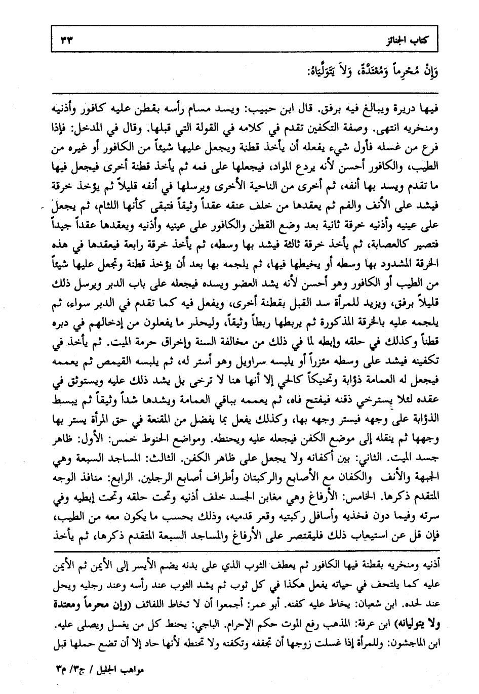 فيها دريرة ويبالغ فيه برفق قال ابن حبيب: ويسد مسام رأسه بقطن عليه كافور وأذنيه ومنخريه انتهى. وصفة التكفين تقدم في كلامه في القولة التي قبلها وقال في المدخل فإذا فرع: من غسله فأول شيء يفعله أن يأخذ قطنة ويجعل عليها شيئا من الكافور أو غيره من الطيب والكافور أحسن لأنه يردع المواد فيجعلها على فمه ثم يأخذ قطنة أخرى فيجعل فيها ما تقدم ويسد بها أنفه ثم أخرى من الناحية الأخرى ويرسلها في أنفه قليلا ثم يؤخذ خرقة فيشد على الأنف والفم ثم يعقدها من خلف عنقه عقدا وثيقا فتبقى كأنها اللثام ثم يجعل على عينيه وأذنيه خرقة ثانية بعد وضع القطن والكافور على عينيه وأذنيه ويعقدها عقدا جيدا فتصير كالعصابة ثم يأخذ خرقة ثالثة فيشد بها وسطه ثم يأخذ خرقة رابعة فيعقدها في هذه الخرقة المشدود بها وسطه أو يخيطها فيها ثم يلجمه بها بعد أن يؤخذ قطنة وتجعل عليها شيئا من الطيب أو الكافور وهو أحسن لأنه يشد العضو ويسده فيجعله على باب الدبر ويرسل ذلك قليلا برفق ويزيد للمرأة سد القبل بقطنة أخرى ويفعل فيه كما تقدم في الدبر سواء ثم يلجمه عليه بالخرقة المذكورة ثم يربطها ربطا وثيقا وليحذر ما يفعلون من إدخالهم في دبره قطنا وكذلك في حلقه وإبطه لما في ذلك من مخالفة السنة وإخراق حرمة الميت ثم يأخذ في تكفينه فيشد على وسطه مئزرا أو يلبسه سراويل وهو أستر له ثم يلبسه القيمص ثم يعممه فيجعل له العمامة ذؤابة وتحنيكا كالحي إلا أنها هنا لا ترخى بل يشد ذلك عليه ويستوثق في عقده لئلا يسترخي ذقنه فيفتح فاه ثم يعممه بباقي العمامة ويشدها شدا وثيقا ثم يبسط الذؤابة على وجهه فيستر وجهه بها وكذلك يفعل بما يفضل من المقنعة في حق المرأة يستر بها وجهها دم ينقله إلى موضع الكفن فيجعله عليه ويحنطه ومواضع الحنوط خمس الأول ظاهر جسد الميت الثاني بين أكفانه ولا يجعل على ظاهر الكفن الثالث المساجد السبعة وهي الجبهة والأنف والكفان مع الأصابع والركبتان وأطراف أصابع الرجلين الرابع منافذ الوجه المتقدم ذكرها الخامس الأرفاغ وهي مغابن الجسد خلف اليسرى وتحت حلقه وتحت إبطيه وفي سرته وفيما دون فخذيه وأسافل ركبتيه وقعر قدميه وذلك بحسب ما يكون معه من الطيب فإن قل عن استيعاب ذلك فليقتصر على الأرفاغ والمساجد السبعة المتقدم ذكرها ثم يأخذ