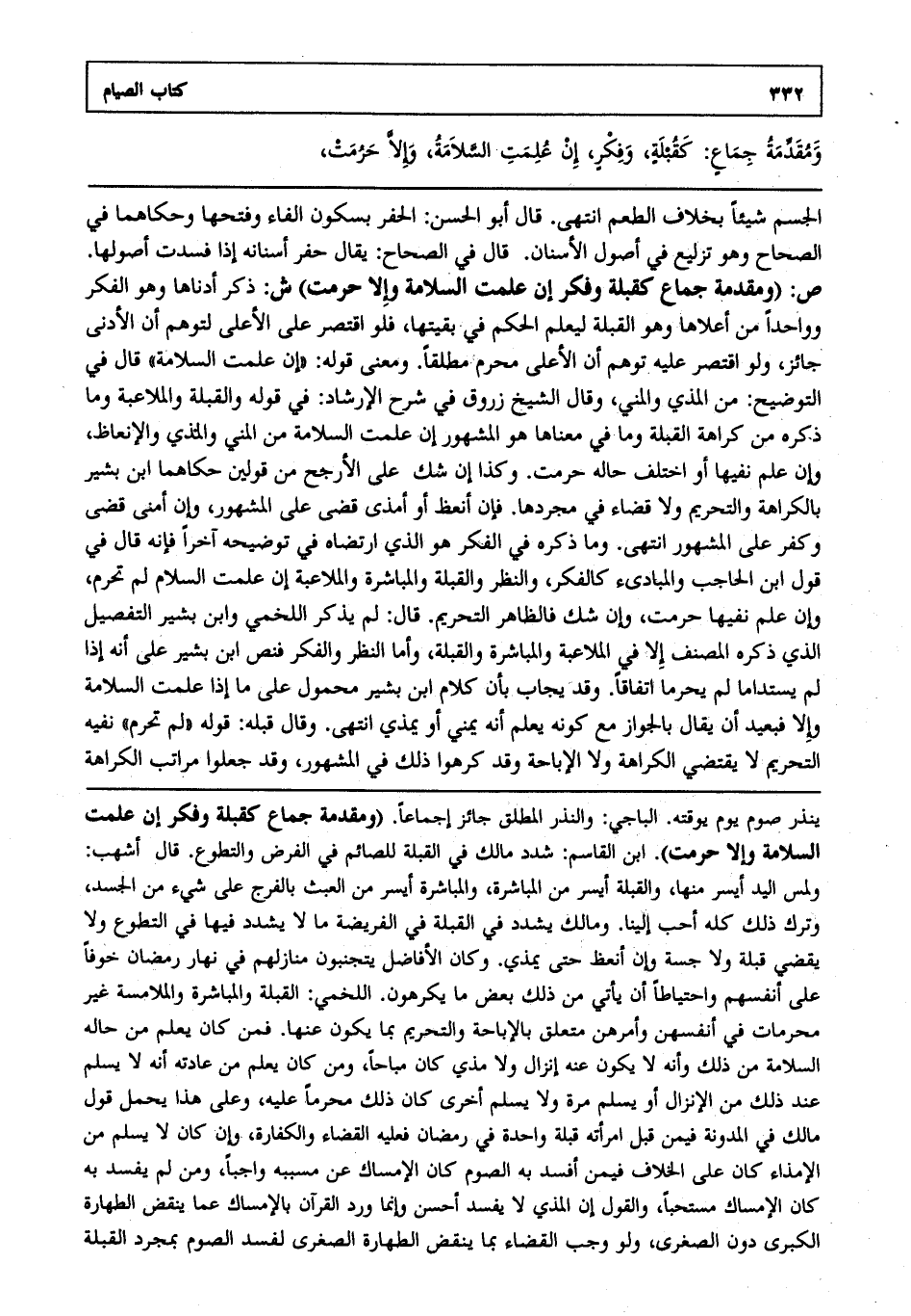 الجسم شيئا بخلاف الطعم انتهى. قال أبو الحسن: الحفر بسكون الفاء وفتحها وحكاهما في الصحاح وهو تزليع في أصول الأسنان قال في الصحاح يقال حفر أسنانه إذا فسدت أصولها. ص: "ومقدمة جماع كقبلة وفكر إن علمت السلامة وإلا حرمت". ش: ذكر أدناها وهو الفكر وواحدا من أعلاها وهو القبلة ليعلم الحكم في بقيتها فلو اقتصر على الأعلى لتوهم أن الأدنى جائز ولو اقتصر عليه توهم أن الأعلى محرم مطلقا ومعنى قوله: إن علمت السلامة قال في التوضيح: من المذي والمني وقال الشيخ زروق في شرح الإرشاد في قوله: والقبلة والملاعبة وما ذكره من كراهة القبلة وما في معناها هو المشهور إن علمت السلامة من المني والمذي والإنعاظ وإن علم نفيها أو اختلف حاله حرمت وكذا إن شك على الأرجح من قولين حكاهما ابن بشير بالكراهة والتحريم ولا قضاء في مجردها فإن أنعظ أو أمذى قضى على المشهور وإن أمنى قضى وكفر على المشهور انتهى. وما ذكره في الفكر هو الذي ارتضاه في توضيحه آخرا فإنه قال في قول ابن الحاجب والمبادىء كالفكر والنظر والقبلة والمباشرة والملاعبة إن علمت السلام لم تحرم وإن علم نفيها حرمت وإن شك فالظاهر التحريم قال لم يذكر اللخمي وابن بشير التفصيل الذي ذكره المصنف إلا في الملاعبة والمباشرة والقبلة وأما النظر والفكر فنص ابن بشير على أنه إذا لم يستداما لم يحرما اتفاقا وقد يجاب بأن كلام ابن بشير محمول على ما إذا علمت السلامة وإلا فبعيد أن يقال بالجواز مع كونه يعلم أنه يمني أو يمذي انتهى. وقال قبله قوله: لم تحرم نفيه التحريم لا يقتضي الكراهة ولا الإباحة وقد كرهوا ذلك في المشهور وقد جعلوا مراتب الكراهة