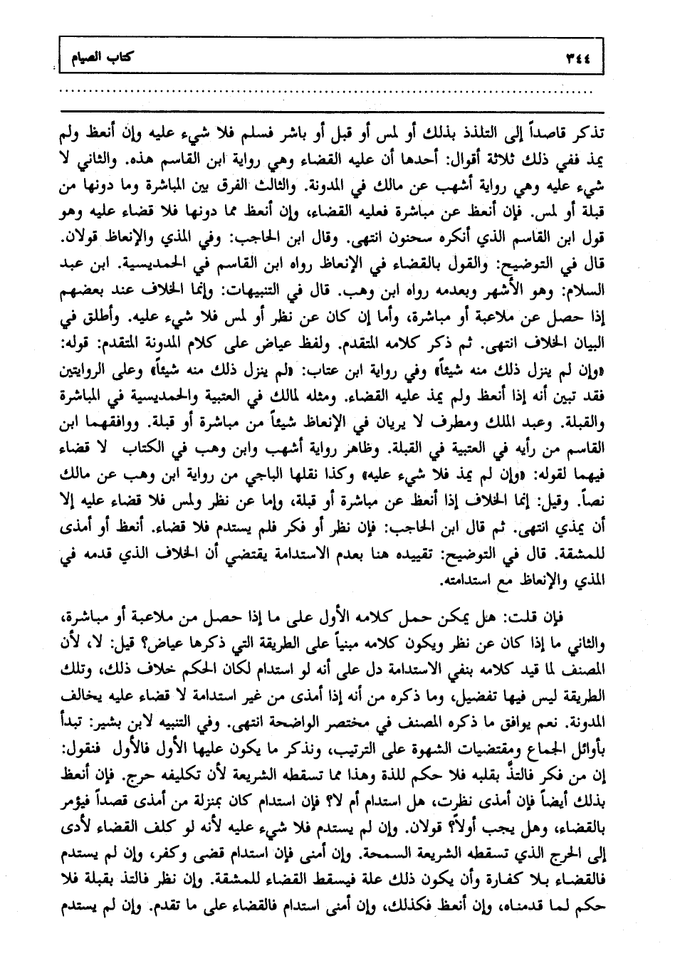 تذكر قاصدا إلى التلذذ بذلك أو لمس أو قبل أو باشر فلا شيء عليه وإن انعظ ولم يمذ ففي ذلك ثلاثة أقوال أحدها أن عليه القضاء وهي رواية ابن القاسم هذه والثاني لا شيء عليه وهي رواية أشهب عن مالك في المدونة والثالث الفرق بين المباشرة وما دونها من قبلة أو لمس فإن أنعظ عن مباشرة فعليه القضاء وإن أنعظ مما دونها فلا قضاء عليه وهو قول ابن القاسم الذي أنكره سحنون انتهى. و قال ابن الحاجب: وفي المذي والإنعاظ قولان قال في التوضيح: والقول بالقضاء في الإنعاظ رواه ابن القاسم في الحمديسية ابن عبد السلام وهو الأشهر وبعدمه رواه ابن وهب قال في التنبيهات وإنما الخلاف عند بعضهم إذا حصل عن ملاعبة أو مباشرة وأما إن كان عن نظر أو لمس فلا شيء عليه وأطلق في البيان الخلاف انتهى. ثم ذكر كلامه المتقدم ولفظ عياض على كلام المدونة المتقدم قوله: وإن لم ينزل ذلك منه شيئا وفي رواية ابن عتاب لم ينزل ذلك منه شيئا وعلى الروايتين فقد تبين أنه إذا انعظ ولم يمذ عليه القضاء ومثله لمالك في العتبية والحمديسية في المباشرة والقبلة وعبد الملك ومطرف لا يريان في الإنعاظ شيئا من مباشرة أو قبلة ووافقهما ابن القاسم من رأيه في العتبية في القبلة وظاهر رواية أشهب وابن وهب في الكتاب لا قضاء فيهما لقوله وإن لم يمذ فلا شيء عليه وكذا نقلها الباجي من رواية ابن وهب عن مالك نصا وقيل إنما الخلاف إذا انعظ عن مباشرة أو قبلة وإما عن نظر ولمس فلا قضاء عليه إلا أن يمذي انتهى. ثم قال ابن الحاجب: فإن نظر أو فكر فلم يستدم فلا قضاء أنعظ أو أمذى للمشقة قال في التوضيح: تقييده هنا بعدم الاستدامة يقتضي أن الخلاف الذي قدمه في المذي والإنعاظ مع استدامته.