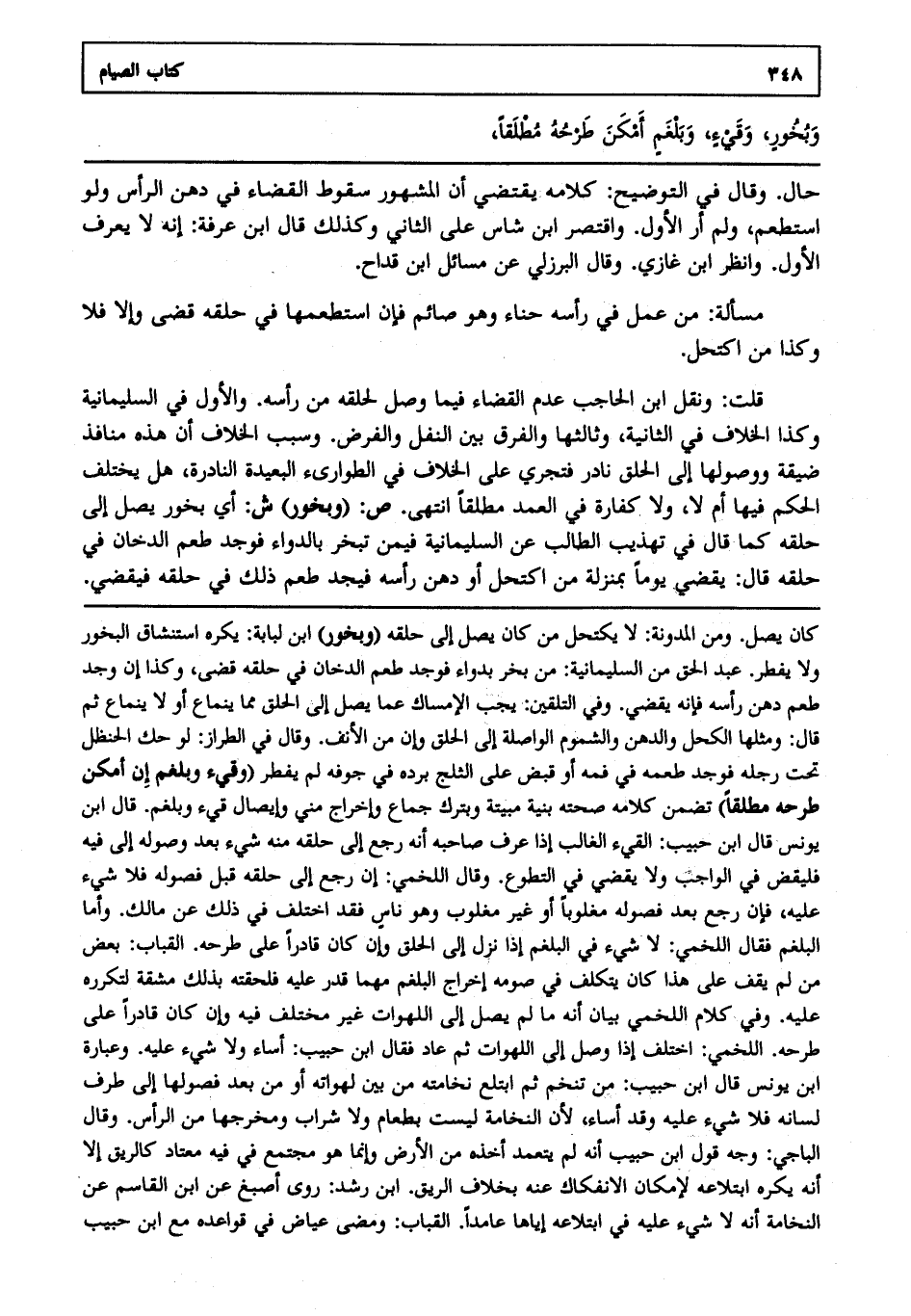 قلت: ونقل ابن الحاجب عدم القضاء فيما وصل لحلقه من رأسه والأول في السليمانية وكذا الخلاف في الثانية وثالثها والفرق بين النفل والفرض وسبب الخلاف أن هذه منافذ ضيقة ووصولها إلى الحلق نادر فتجري على الخلاف في الطوارىء البعيدة النادرة هل يختلف الحكم فيها أم لا ولا كفارة في العمد مطلقا انتهى. ص: "وبخور". ش: أي بخور يصل إلى حلقه كما قال في تهذيب الطالب عن السليمانية فيمن تبخر بالدواء فوجد طعم الدخان في حلقه قال يقضي يوما بمنزلة من اكتحل أو دهن رأسه فيجد طعم ذلك في حلقه فيقضي.