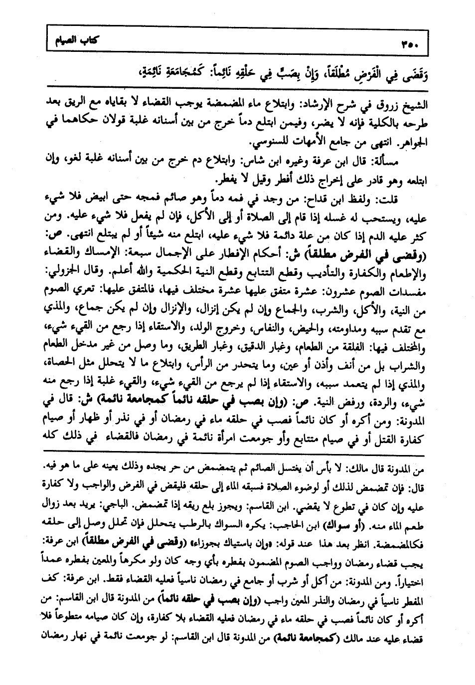 قلت: ولفظ ابن قداح من وجد في فمه دما وهو صائم فمجه حتى أبيض فلا شيء عليه ويستحب له غسله إذا قام إلى الصلاة أو إلى الأكل فإن لم يفعل فلا شيء عليه ومن كثر عليه الدم إذا كان من علة دائمة فلا شيء عليه ابتلع منه شيئا أو لم يبتلع انتهى. ص: "وقضى في الفرض مطلقا". ش: أحكام الإفطار على الإجمال سبعة الإمساك والقضاء والإطعام والكفارة والتأديب وقطع التتابع وقطع النية الحكمية والله أعلم. وقال الجزولي مفسدات الصوم عشرون عشرة متفق عليها عشرة مختلف فيها فالمتفق عليها تعري الصوم من النية والأكل والشرب والجماع وإن لم يكن إنزال والإنزال وإن لم يكن جماع والمذي مع تقدم سببه ومداومته والحيض والنفاس وخروج الولد والاستقاء إذا رجع من القيء شيء والمختلف فيها الفلقة من الطعام وغبار الدقيق وغبار الطريق وما وصل من غير مدخل الطعام والشراب بل من أنف وأذن أو عين وما يتحدر من الرأس وابتلاع ما لا يتحلل مثل الحصاة والمذي إذا لم يتعمد سببه والاستقاء إذا لم يرجع من القيء شيء والقيء غلبة إذا رجع منه شيء والردة ورفض النية. ص: "وإن بصب في حلقه نائما كمجامعة نائمة". ش: قال في المدونة ومن أكره أو كان نائما فصب في حلقه ماء في رمضان أو في نذر أو ظهار أو صيام كفارة القتل أو في صيام متتابع وأو جومعت امرأة نائمة في رمضان فالقضاء في ذلك كله