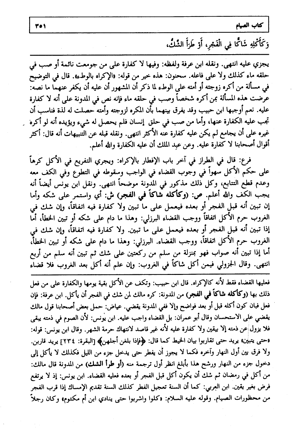 فرع: قال في الطراز: في آخر باب الإفطار بالإكراه: ويجري التفريع في الأكل كرها على حكم الأكل سهوا في وجوب القضاء في الواجب وسقوطه في التطوع وفي الكف معه وعدم قطع التتابع وكل ذلك مذكور في المدونة موضحا انتهى. ونقل ابن يونس أيضا أنه يجب الكف والله أعلم. ص: "وكأكله شاكا في الفجر". ش: أي واستمر على شكه وأماإن تبين أنه قبل الفجر أو بعده فيعمل على ما تبين ولا كفارة فيه اتفاقا وإن شك في الغروب حرم الأكل اتفاقا ووجب القضاء البرزلي وهذا ما دام على شكه أو تبين الخطأ أما إذا تبين أنه صواب فهو بمنزلة من سلم من ركعتين على شك ثم تبين أنه سلم من أربع انتهى. وقال الجزولي فيمن أكل شاكا في الغروب وإن علم أنه أكل بعد الغروب فلا قضاء