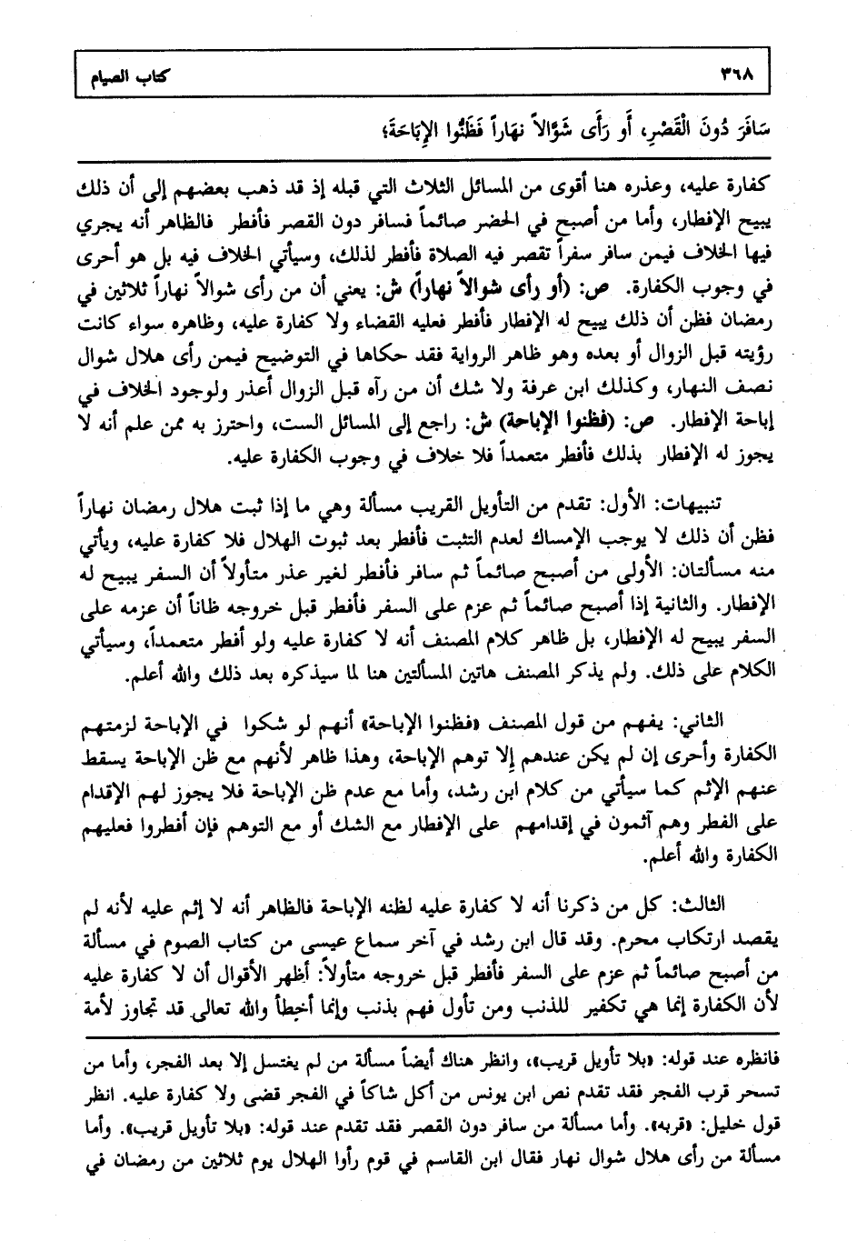 تنبيهات: الأول: تقدم من التأويل القريب مسألة وهي ما إذا ثبت هلال رمضان نهارا فظن أن ذلك لا يوجب الإمساك لعدم التثبت فأفطر بعد ثبوت الهلال فلا كفارة عليه ويأتي منه مسألتان الأولى من أصبح صائما ثم سافر فأفطر لغير عذر متأولا أن السفر يبيح له الإفطار والثانية إذا أصبح صائما ثم عزم على السفر فأفطر قبل خروجه ظانا أن عزمه على السفر يبيح له الإفطار بل ظاهر كلام المصنف أنه لا كفارة عليه ولو أفطر متعمدا وسيأتي الكلام على ذلك ولم يذكر المصنف هاتين المسألتين هنا لما سيذكره بعد ذلك والله أعلم.