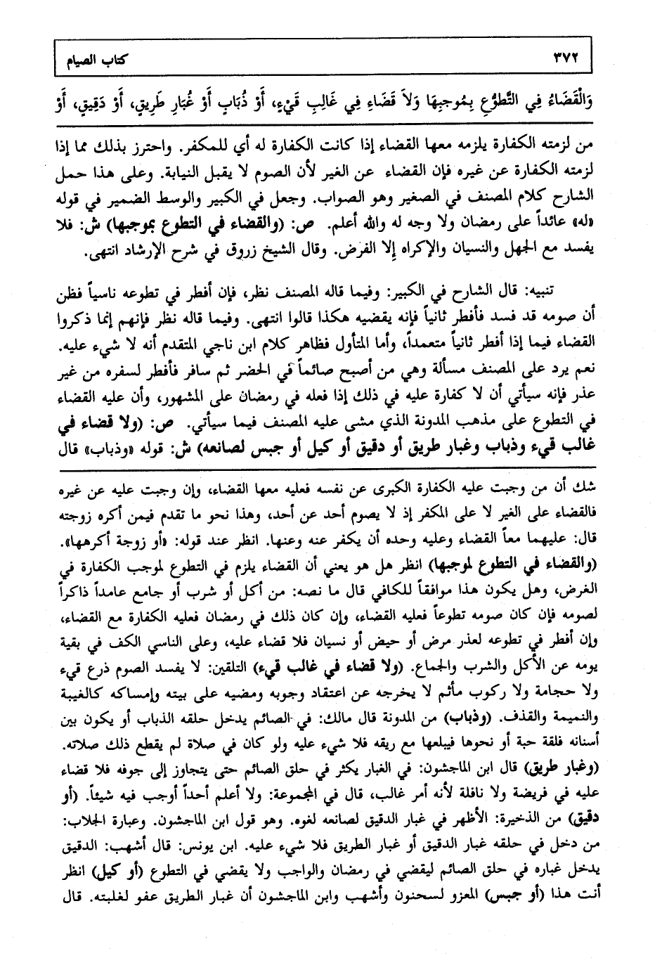 والقضاء في التطوع بموجبها ولا قضاء في غالب قيء أو ذباب أو غبار طريق أو دقيق أو