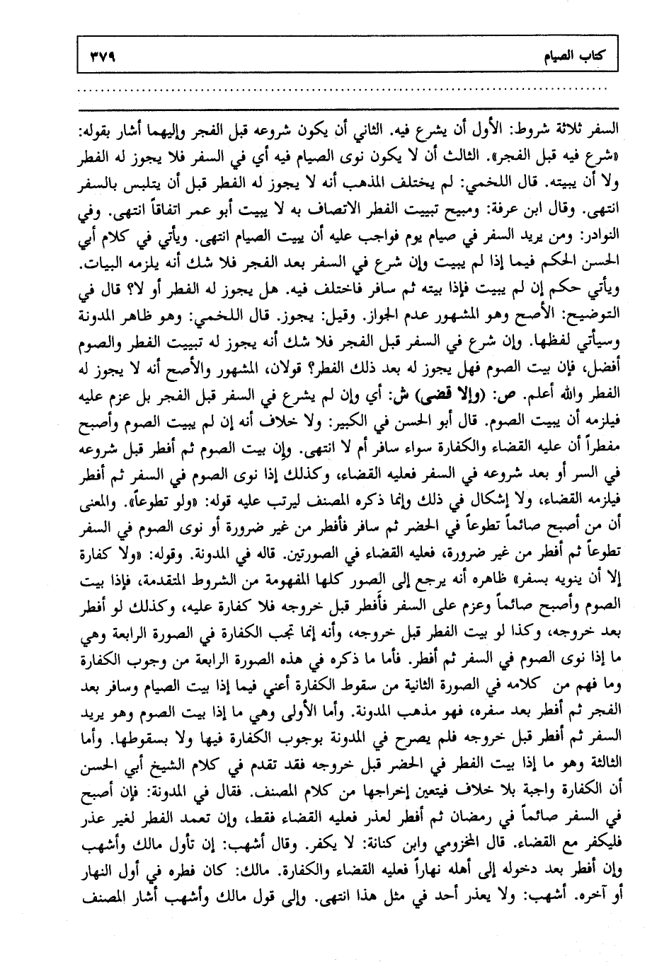السفر ثلاثة شروط الأول أن يشرع فيه الثاني أن يكون شروعه قبل الفجر وإليهما أشار بقوله شرع فيه قبل الفجر الثالث أن لا يكون نوى الصيام فيه أي في السفر فلا يجوز له الفطر ولا أن يبيته قال اللخمي: لم يختلف المذهب أنه لا يجوز له الفطر قبل أن يتلبس بالسفر انتهى. وقال ابن عرفة: ومبيح تبييت الفطر الاتصاف به لا يبيت أبو عمر اتفاقا انتهى. وفي النوادر ومن يريد السفر في صيام يوم فواجب عليه أن يبيت الصيام انتهى. ويأتي في كلام أبي الحسن الحكم فيما إذا لم يبيت وإن شرع في السفر بعد الفجر فلا شك أنه يلزمه البيات ويأتي حكم إن لم يبيت فإذا بيته ثم سافر فاختلف فيه هل يجوز له الفطر أو لا قال في التوضيح: الأصح وهو المشهور عدم الجواز وقيل يجوز قال اللخمي: وهو ظاهر المدونة وسيأتي لفظها وإن شرع في السفر قبل الفجر فلا شك أنه يجوز له تبييت الفطر والصوم أفضل فإن بيت الصوم فهل يجوز له بعد ذلك الفطر قولان المشهور والأصح أنه لا يجوز له الفطر والله أعلم. ص: "وإلا قضى". ش: أي وإن لم يشرع في السفر قبل الفجر بل عزم عليه فيلزمه أن يبيت الصوم قال أبو الحسن في الكبير: ولا خلاف أنه إن لم يبيت الصوم وأصبح مفطرا أن عليه القضاء والكفارة سواء سافر أم لا انتهى. وإن بيت الصوم ثم أفطر قبل شروعه في السفر أو بعد شروعه في السفر فعليه القضاء وكذلك إذا نوى الصوم في السفر ثم أفطر فيلزمه القضاء ولا إشكال في ذلك وإنما ذكره المصنف ليرتب عليه قوله: ولو تطوعا والمعنى أن من أصبح صائما تطوعا في الحضر ثم سافر فأفطر من غير ضرورة أو نوى الصوم في السفر تطوعا ثم أفطر من غير ضرورة فعليه القضاء في الصورتين قاله في المدونة وقوله ولا كفارة إلا أن ينويه بسفر ظاهره أنه يرجع إلى الصور كلها المفهومة من الشروط المتقدمة فإذا بيت الصوم وأصبح صائما وعزم على السفر فأفطر قبل خروجه فلا كفارة عليه وكذلك لو أفطر بعد خروجه وكذا لو بيت الفطر قبل خروجه وأنه إنما تجب الكفارة في الصورة الرابعة وهي ما إذا نوى الصوم في السفر ثم أفطر فأما ما ذكره في هذه الصورة الرابعة من وجوب الكفارة وما فهم من كلامه في الصورة الثانية من سقوط الكفارة أعني فيما إذا بيت الصيام وسافر بعد الفجر ثم أفطر بعد سفره فهو مذهب المدونة وأما الأولى وهي ما إذا بيت الصوم وهو يريد السفر ثم أفطر قبل خروجه فلم يصرح في المدونة بوجوب الكفارة فيها ولا بسقوطها وأما الثالثة وهو ما إذا بيت الفطر في الحضر قبل خروجه فقد تقدم في كلام الشيخ أبي الحسن أن الكفارة واجبة بلا خلاف فيتعين إخراجها من كلام المصنف فقال في المدونة فإن أصبح في السفر صائما في رمضان ثم أفطر لعذر فعليه القضاء فقط وإن تعمد الفطر لغير عذر فليكفر مع القضاء قال المخزومي وابن كنانة لا يكفر وقال أشهب: إن تأول مالك وأشهب وإن أفطر بعد دخوله إلى أهله نهارا فعليه القضاء والكفارة مالك كان فطره في أول النهار أو آخره أشهب ولا يعذر أحد في مثل هذا انتهى. وإلى قول مالك وأشهب أشار المصنف