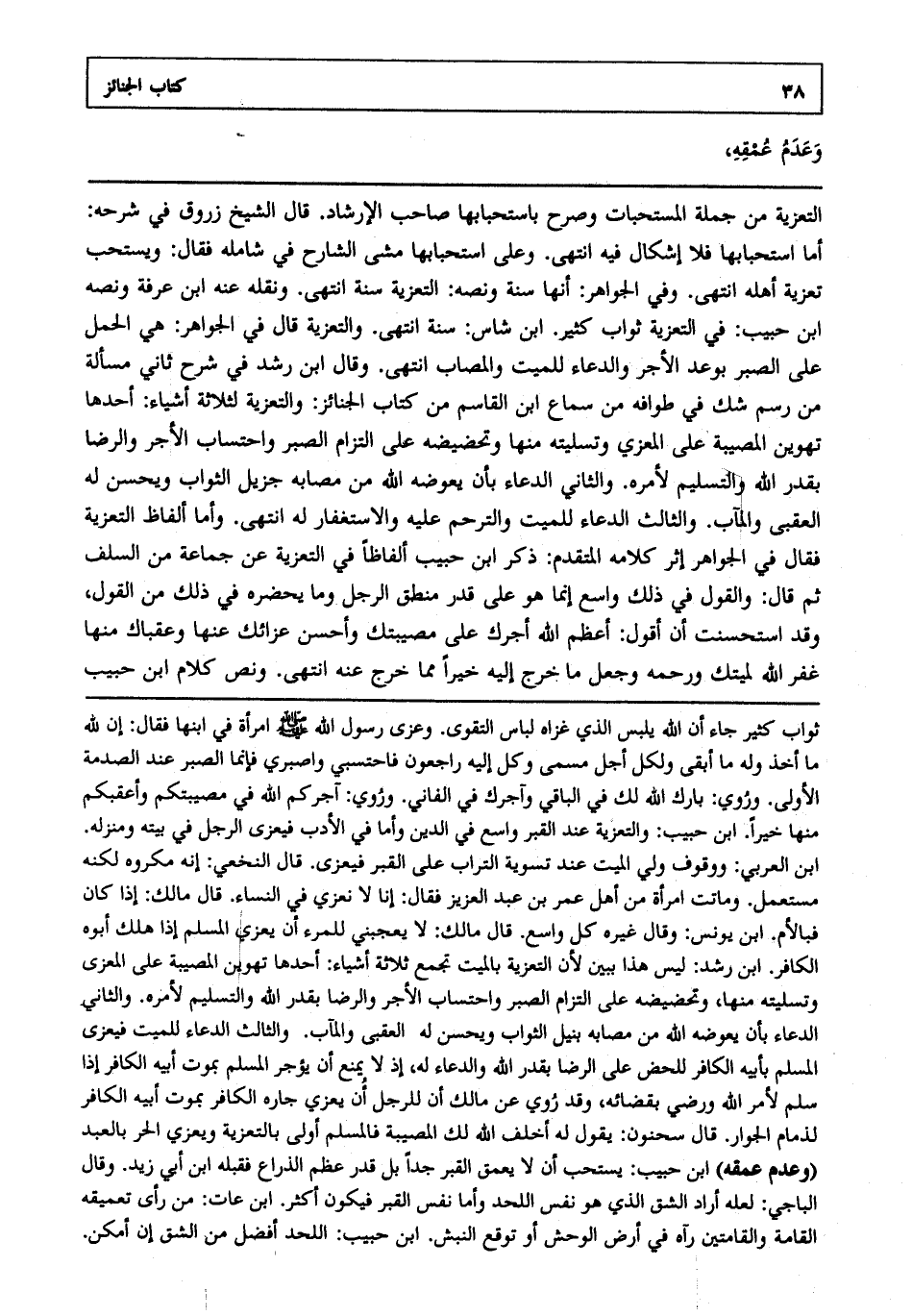 التعزية من جملة المستحبات وصرح باستحبابها صاحب الإرشاد قال الشيخ زروق في شرحه أما استحبابها فلا إشكال فيه انتهى. وعلى استحبابها مشى الشارح في شامله فقال ويستحب تعزية أهله انتهى. وفي الجواهر أنها سنة ونصه التعزية سنة انتهى. ونقله عنه ابن عرفة ونصه ابن حبيب في التعزية ثواب كثير ابن شاس سنة انتهى. والتعزية قال في الجواهر: هي الحمل على الصبر بوعد الأجر والدعاء للميت والمصاب انتهى. وقال ابن رشد في شرح ثاني مسألة من رسم شك في طوافه من سماع ابن القاسم من كتاب الجنائز والتعزية لثلاثة أشياء أحدها تهوين المصيبة على المعزي وتسليته منها وتحضيضه على التزام الصبر واحتساب الأجر والرضا بقدر الله والتسليم لأمره والثاني الدعاء بأن يعوضه الله من مصابه جزيل الثواب ويحسن له العقبى والمآب والثالث الدعاء للميت والترحم عليه والاستغفار له انتهى. وأما ألفاظ التعزية فقال في الجواهر إثر كلامه المتقدم ذكر ابن حبيب ألفاظا في التعزية عن جماعة من السلف ثم قال والقول في ذلك واسع إنما هو على قدر منطق الرجل وما يحضره في ذلك من القول وقد استحسنت أن أقول أعظم الله أجرك على مصيبتك وأحسن عزائك عنها وعقباك منها غفر الله لميتك ورحمه وجعل ما خرج إليه خيرا مما خرج عنه انتهى. ونص كلام ابن حبيب