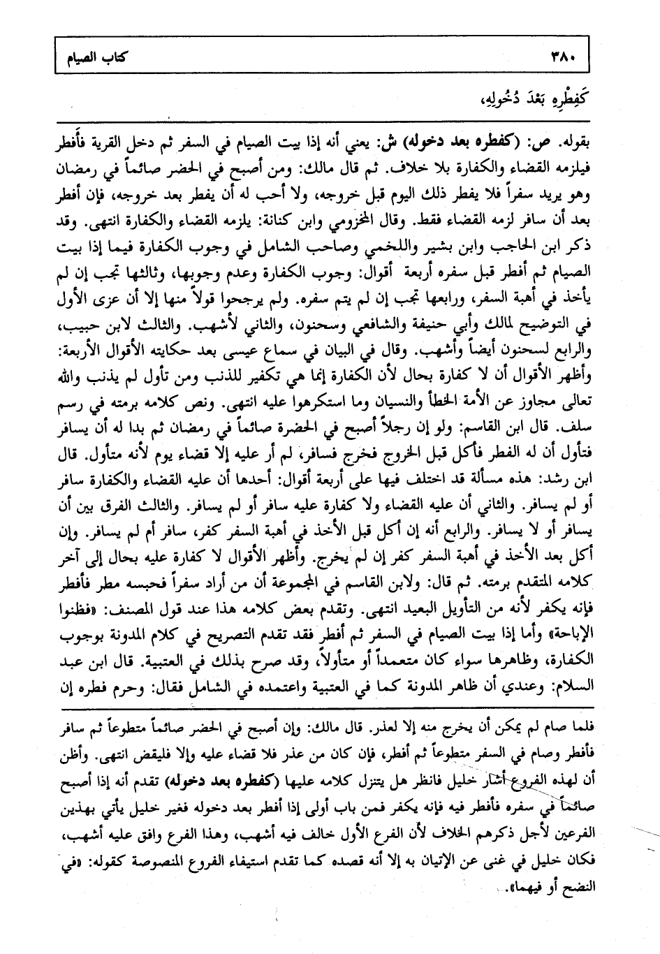 بقوله. ص: "كفطره بعد دخوله". ش: يعني أنه إذا بيت الصيام في السفر ثم دخل القرية فأفطر فيلزمه القضاء والكفارة بلا خلاف ثم قال مالك: ومن أصبح في الحضر صائما في رمضان وهو يريد سفرا فلا يفطر ذلك اليوم قبل خروجه ولا أحب له أن يفطر بعد خروجه فإن أفطر بعد أن سافر لزمه القضاء فقط وقال المخزومي وابن كنانة يلزمه القضاء والكفارة انتهى. وقد ذكر ابن الحاجب وابن بشير واللخمي وصاحب الشامل في وجوب الكفارة فيما إذا بيت الصيام ثم أفطر قبل سفره أربعة أقوال وجوب الكفارة وعدم وجوبها وثالثها تجب إن لم يأخذ في أهبة السفر ورابعها تجب إن لم يتم سفره ولم يرجحوا قولا منها إلا أن عزىالأول في التوضيح لمالك وأبي حنيفة والشافعي وسحنون والثاني لأشهب والثالث لابن حبيب والرابع لسحنون أيضا وأشهب وقال في البيان في سماع عيسى بعد حكايته الأقوال الأربعة وأظهر الأقوال أن لا كفارة بحال لأن الكفارة إنما هي تكفير للذنب ومن تأول لم يذنب والله تعالى مجاوز عن الأمة الخطأ والنسيان وما استكرهوا عليه انتهى. ونص كلامه برمته في رسم سلف قال ابن القاسم: ولو إن رجلا أصبح في الحضرة صائما في رمضان ثم بدا له أن يسافر فتأول أن له الفطر فأكل قبل الخروج فخرج فسافر لم أر عليه إلا قضاء يوم لأنه متأول قال ابن رشد: هذه مسألة قد اختلف فيها على أربعة أقوال أحدها أن عليه القضاء والكفارة سافر أو لم يسافر والثاني أن عليه القضاء ولا كفارة عليه سافر أو لم يسافر والثالث الفرق بين أن يسافر أو لا يسافر والرابع أنه إن أكل قبل الأخذ في أهبة السفر كفر سافر أم لم يسافر وإن أكل بعد الأخذ في أهبة السفر كفر إن لم يخرج وأظهر الأقوال لا كفارة عليه بحال إلى آخر كلامه المتقدم برمته ثم قال ولابن القاسم في المجموعة أن من أراد سفرا فحبسه مطر فأفطر فإنه يكفر لأنه من التأويل البعيد انتهى. وتقدم بعض كلامه هذا عند قول المصنف فظنوا الإباحة وأما إذا بيت الصيام في السفر ثم أفطر فقد تقدم التصريح في كلام المدونة بوجوب الكفارة وظاهرها سواء كان متعمدا أو متأولا وقد صرح بذلك في العتبية قال ابن عبد السلام: وعندي أن ظاهر المدونة كما في العتبية واعتمده في الشامل فقال وحرم فطره إن