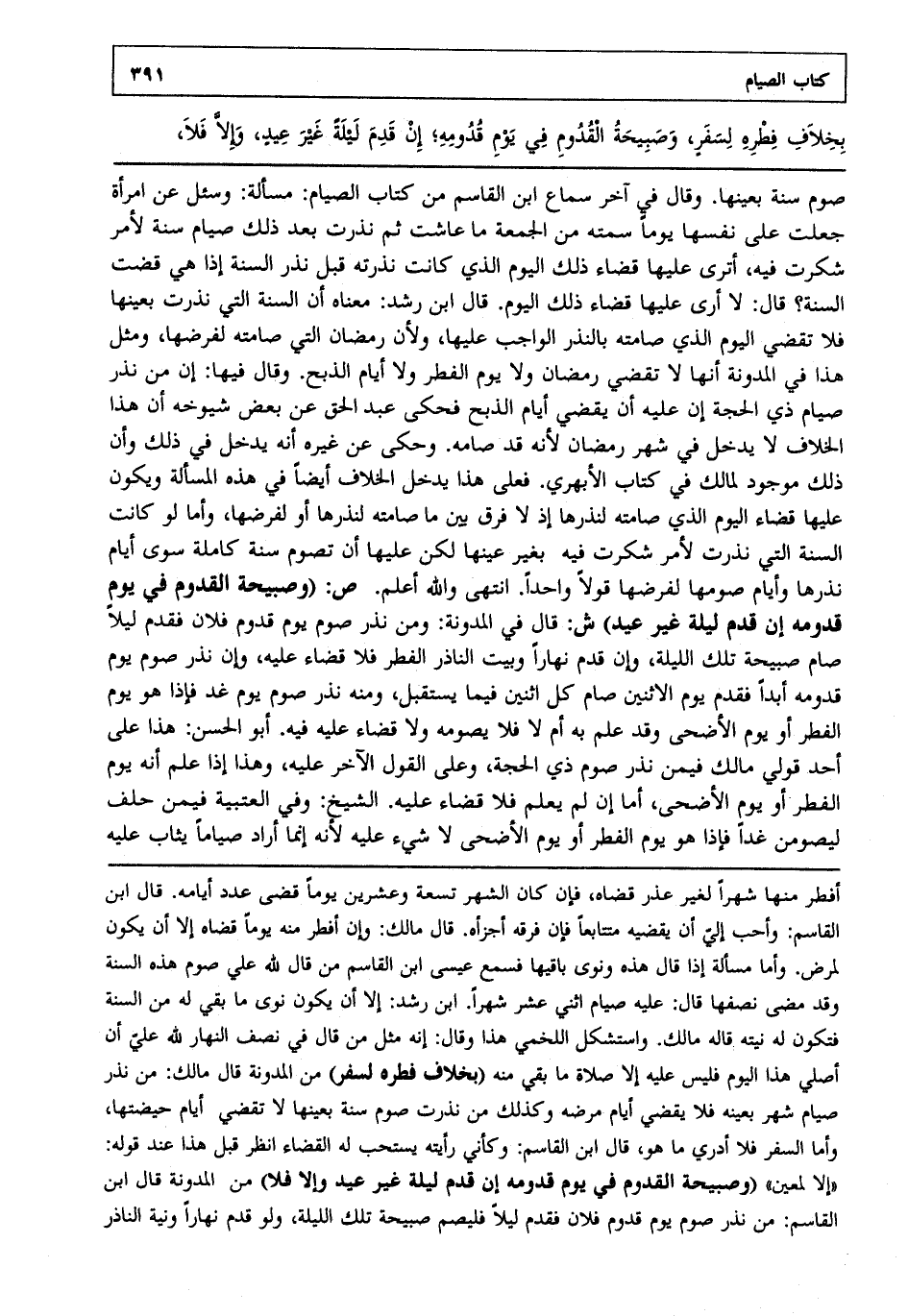 صوم سنة بعينها وقال في آخر سماع ابن القاسم من كتاب الصيام مسألة: وسئل عن امرأة جعلت على نفسها يوما سمته من الجمعة ما عاشت ثم نذرت بعد ذلك صيام سنة لأمر شكرت فيه أترى عليها قضاء ذلك اليوم الذي كانت نذرته قبل نذر السنة إذا هي قضت السنة قال لا أرى عليها قضاء ذلك اليوم قال ابن رشد: معناه أن السنة التي نذرت بعينها فلا تقضي اليوم الذي صامته بالنذر الواجب عليها ولأن رمضان التي صامته لفرضها ومثل هذا في المدونة أنها لا تقضي رمضان ولا يوم الفطر ولا أيام الذبح وقال فيها إن من نذر صيام ذي الحجة إن عليه أن يقضي أيام الذبح فحكى عبد الحق عن بعض شيوخه أن هذا الخلاف لا يدخل في شهر رمضان لأنه قد صامه وحكى عن غيره أنه يدخل في ذلك وأن ذلك موجود لمالك في كتاب الأبهري فعلى هذا يدخل الخلاف أيضا في هذه المسألة ويكون عليها قضاء اليوم لالذي صامته لنذرها إذ لا فرق بين ما صامته لنذرها أو لفرضها وأما لو كانت السنة التي نذرت لأمر شكرت فيه بغير عينها لكن عليها أن تصوم سنة كاملة سوى أيام نذرها وأيام صومها لفرضها قولا واحدا انتهى. والله أعلم. ص: "وصبيحة القدوم في يوم قدومه إن قدم ليلة غير عيد". ش: قال في المدونة ومن نذر صوم يوم قدوم فلان فقدم ليلا صام صبيحة تلك الليلة وإن قدم نهارا وبيت الناذر الفطر فلا قضاء عليه وإن نذر صوم يوم قدومه أبدا فقدم يوم الاثنين صام كل اثنين فيما يستقبل ومنه نذر صوم يوم غد فإذا هو يوم الفطر أو يوم الأضحى وقد علم به أم لا فلا يصومه ولا قضاء عليه فيه أبو الحسن هذا على أحد قولي مالك فيمن نذر صوم ذي الحجة وعلى القول الآخر عليه وهذا إذا علم أنه يوم الفطر أو يوم الأضحى أما إن لم يعلم فلا قضاء عليه الشيخ وفي العتبية فيمن حلف ليصومن غدا فإذا هو يوم الفطر أو يوم الأضحى لا شيء عليه لأنه إنما أراد صياما يثاب عليه