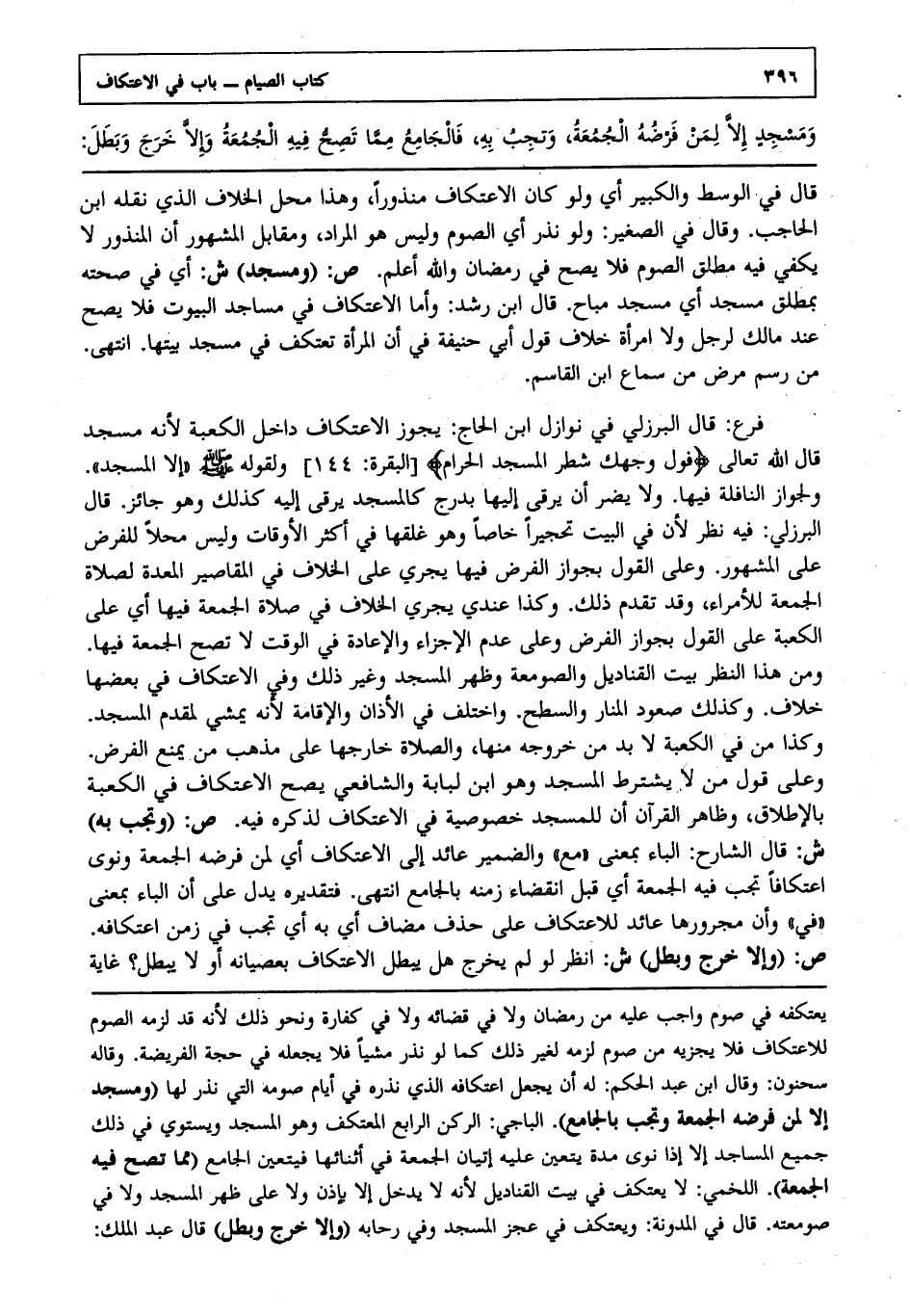قال في الوسط والكبير: أي ولو كان الاعتكاف منذورا وهذا محل الخلاف الذي نقله ابن الحاجب وقال في الصغير ولو نذر أي الصوم وليس هو المراد ومقابل المشهور أن المنذور لا يكفي فيه مطلق الصوم فلا يصح في رمضان والله أعلم. ص: "ومسجد". ش: أي في صحته بمطلق مسجد أي مسجد مباح قال ابن رشد: وأما الاعتكاف في مساجد البيوت فلا يصح ثم مالك لرجل ولا امرأة خلاف قول أبي حنيفة في أن المرأة تعتكف في مسجد بيتها انتهى. من رسم مرض من سماع ابن القاسم.