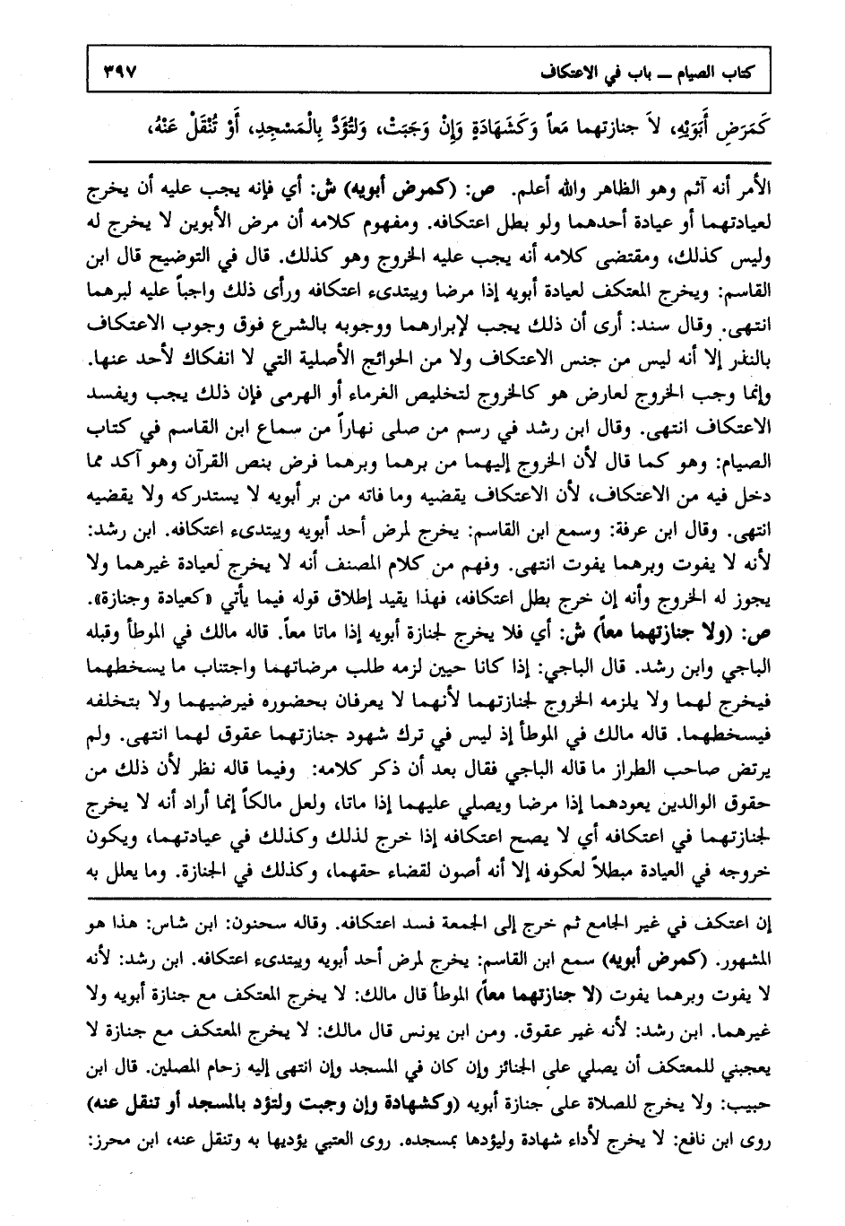 الأمر أنه آثم وهو الظاهر والله أعلم. ص: "كمرض أبويه". ش: أي فإنه يجب عليه أن يخرج لعيادتهما أو عيادة أحدهما ولو بطل اعتكافه ومفهوم كلامه أن مرض الأبوين لا يخرج له وليس كذلك ومقتضى كلامه أنه يجب عليه الخروج وهو كذلك قال في التوضيح: قال ابن القاسم: ويخرج المعتكف لعيادة أبويه إذا مرضا ويبتدىء اعتكافه ورأى ذلك واجبا عليه لبرهما انتهى. وقال سند أرى أن ذلك يجب لإبرارهما ووجوبه بالشرع فوق وجوب الاعتكاف بالنذر إلا أنه ليس من جنس الاعتكاف ولا من الحوائج الأصلية التي لا انفكاك لأحد عنها وإنما وجب الخروج لعارض هو كالخروج لتخليص الغرماء أو الهرمى فإن ذلك يجب ويفسد الاعتكاف انتهى. وقال ابن رشد في رسم من صلى نهارا من سماع ابن القاسم في كتاب الصيام وهو كما قال لأن الخروج إليهما من برهما وبرهما فرض بنص القرآن وهو آكد مما دخل فيه من الاعتكاف لأن الاعتكاف يقضيه وما فاته من بر أبويه لا يستدركه ولا يقضيه انتهى. وقال ابن عرفة: وسمع ابن القاسم يخرج لمرض أحد أبويه ويبتدىء اعتكافه ابن رشد لأنه لا يفوت وبرهما يفوت انتهى. وفهم من كلام المصنف أنه لا يخرج لعيادة غيرهما ولا يجوز له الخروج وأنه إن خرج بطل اعتكافه فهذا يقيد إطلاق قوله فيما يأتي كعيادة وجنازة. ص: "ولا جنازتهما معا". ش: أي فلا يخرج لجنازة أبويه إذا ماتا معا قاله مالك في الموطأ وقبله الباجي وابن رشد قال الباجي إذا كانا حيين لزمه طلب مرضاتهما واجتناب ما يسخطهما فيخرج لهما ولا يلزمه الخروج لجنازتهما لأنهما لا يعرفان بحضوره فيرضيهما ولا بتخلفه فيسخطهما قاله مالك في الموطأ إذ ليس في ترك شهود جنازتهما عقوق لهما انتهى. ولم يرتض صاحب الطراز ما قاله الباجي فقال بعد أن ذكر كلامه وفيما قاله نظر لأن ذلك من حقوق الوالدين يعودهما إذا مرضا ويصلي عليهما إذا ماتا ولعل مالكا إنما أراد أنه لا يخرج لجنازتهما في اعتكافه أي لا يصح اعتكافه إذا خرج لذلك وكذلك في عيادتهما ويكون خروجه في العيادة مبطلا لعكوفه إلا أنه أصون لقضاء حقهما وكذلك في الجنازة وما يعلل به
