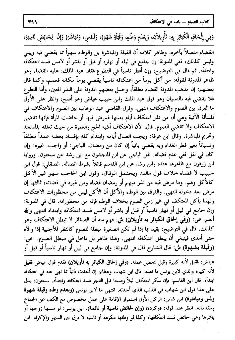 القضاء متصلا بآخره وظاهر كلامه أن القبلة والمباشرة بل والوطء سهوا مما يقضي فيه ويبني وليس كذلك ففي المدونة إن جامع في ليله أو نهاره أو قبل أو باشر أو لامس فسد اعتكافه وابتدأه ثم قال في التوضيح: وإن أفطر ناسيا في التطوع فقال عبد الملك عليه القضاء وهو ظاهر المدونة لقوله من أكل يوما من اعتكافه ناسيا يقضي يوما مكانه فعمم وكذا قال بعضهم إن مذهب المدونة القضاء مطلقا وحمل بعضهم المدونة على النذر المعين وأما التطوع فلا يقضي فيه بالنسيان وهو قول عبد الملك وابن حبيب عياض وهو أصح وانظر على الأول ما الفرق بين الصوم والاعتكاف انتهى. وفرق القاضي عبد الوهاب بين الصوم والاعتكاف في المسألة الآتية وهي أن من نذر اعتكاف أيام بعينها فمرض فيها أو حاضت المرأة فإنها تقضي الاعتكاف ولا تقضي الصوم قال لأن الاعتكاف أشبه الحج والعمرة من حيث تعلقه بالمسجد وتحريم المباشرة وقال ابن عرفة: ويجب اتصال أيامه وابتداء كله بإفساد بعضه عمدا مطلقا ونسيانا بغير فطر الغذاء وبه يقضي بانيا إن كان من رمضان الباجي أو واجب غيره وإن كان في نفل ففي عدم قضائه نقل الباجي عن ابن الماجشون مع ابن رشد عن سحنون ورواية ابن زرقون مع ظاهرها عنده وابن رشد عن ابن القاسم قائلا بشرط اتصاله الصقلي قول ابن حبيب لا قضاء خلاف قول مالك ويحتمل الوفاق وقول ابن الحاجب سهو غير الأكل كالأكل وهم وما مرض فيه من نذر مبهم أو رمضان قضاه ومن غيره في قضائه ثالثها إن مرض بعد دخوله انتهى. والفرق بين الوطء والأكل أن الأكل ليس من محظورات الاعتكاف ولهذا يأكل المعتكف في غير زمن الصوم بخلاف الوطء فإنه من محظوراته قال في المدونة وإن جامع في ليل أو نهار ناسيا أو قبل أو باشر أو لامس فسد اعتكافه وابتدأه انتهى. والله أعلم. ص: "وفي إلحاق الكبائر به تأويلان". ش: فهم منه أن الصغائر لا تبطل الاعتكاف وهو كذلك قال في التوضيح: يقيد بما إذا لم تكن الصغيرة مبطلة للصوم كالنظر للأجنبي إذا والاه حتى أمذى فينبغي أن يبطل اعتكافه انتهى. وهذا ظاهر بل داخل في مبطل الصوم. ص: "وقبلة بشهوة". ش: قال الشارح قال في المدونة وإن جامع في ليل أو نهار ناسيا أو قبل أو
